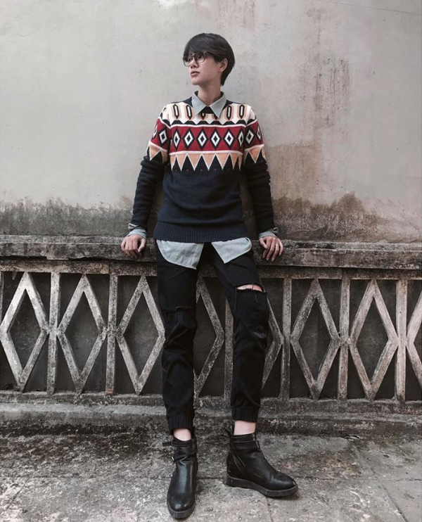 Hà Kino vô cùng mạnh mẽ và thời thượng khi tạo điểm nhấn trên set đồ bằng chiếc áo len in họa tiết nổi bật. Đây chính là một trong những tips hòa phối trang phục siêu thú vị dành cho các cô nàng yêu thích phong cách tomboy.