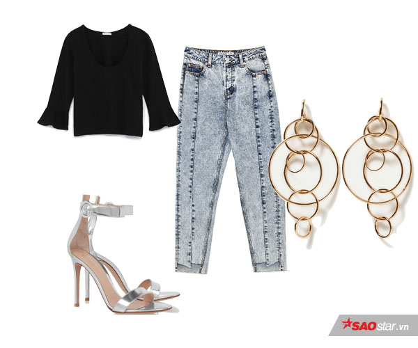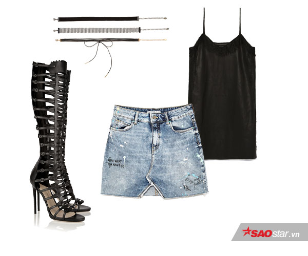 Đối với những cô nàng mê vẻ gợi cảm, cá tính thì có thể tham khảo cách mix-match giữa áo 2 dây, chân váy denim và đôi cao gót chiến binh như người đẹp Hằng Nguyễn.