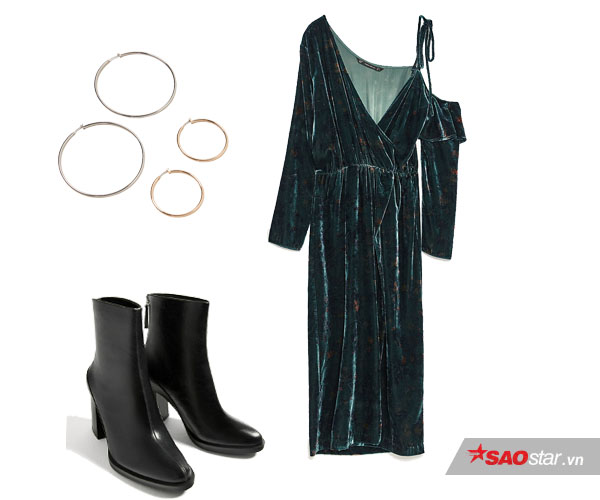 Đôi khi cảm thấy những mẫu váy 2 dây quá hở thì các nàng cũng có thể lựa chọn chiếc đầm nhung với tay áo bất đối xứng như hình.