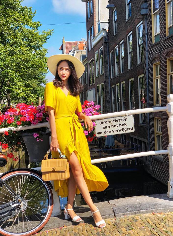Á hậu Tường San cũng chọn cho mình chiếc váy vàng đơn giản trong chuyến du lịch gần đây.