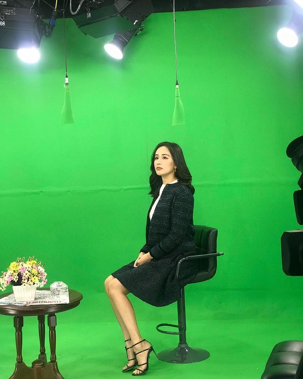 Trong một buổi ghi hình, Mai Phương Thúy chọn set đồ dáng âu phục vải tweed màu đen matching với nhau mix cùng giày cao gót quai mảnh