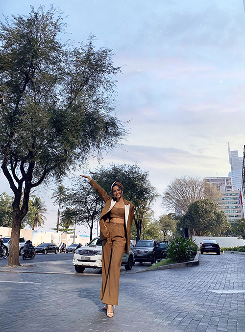 Hoa hậu H'Hen Niê lựa chọn kết hợp giữa áo crop-top, quần suông , blazer dáng rộng cùng băng đô quấn tóc đầy ấn tượng cho set đồ thanh lịch của mình
