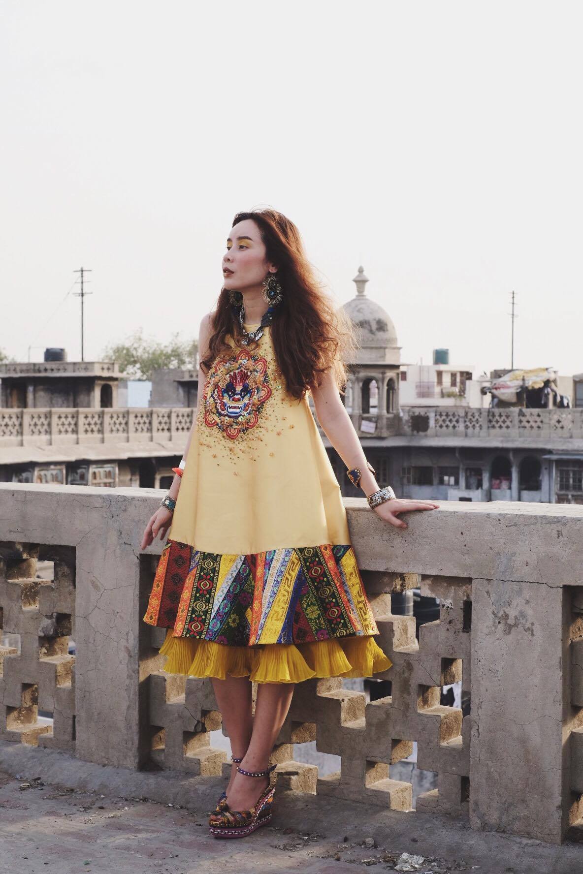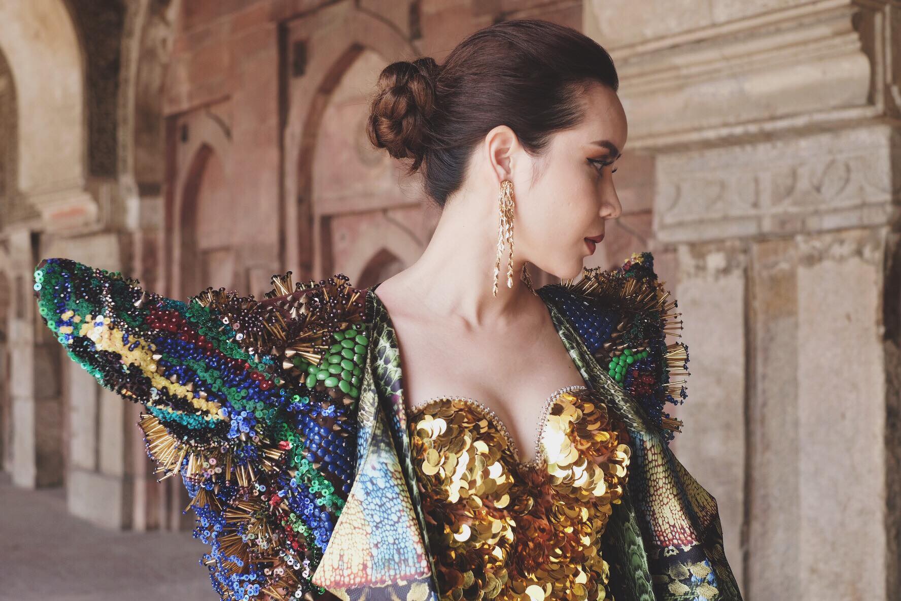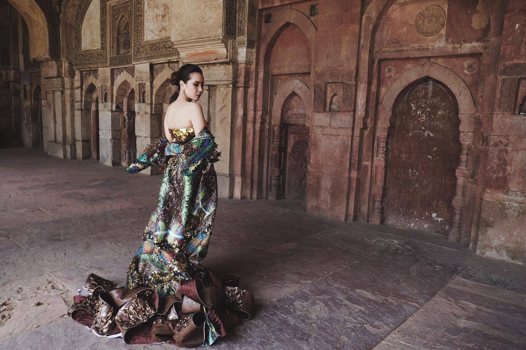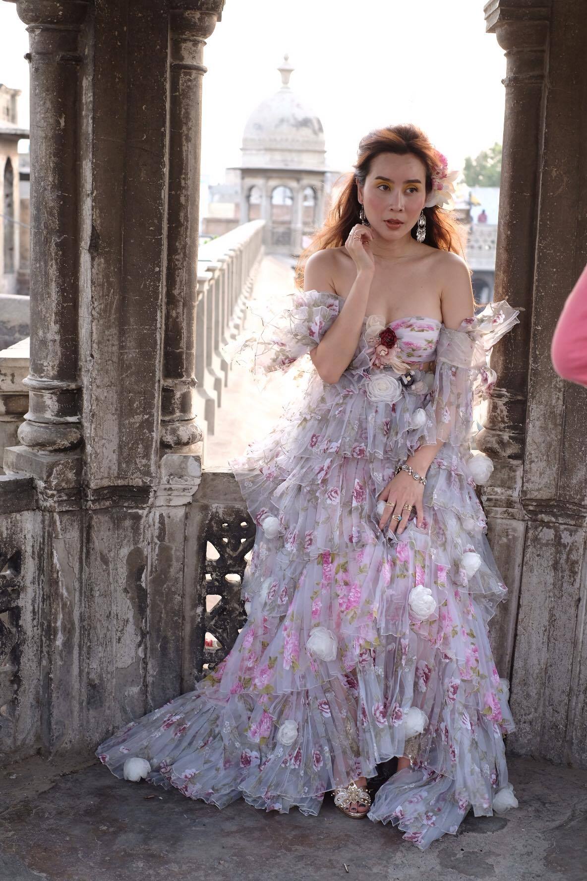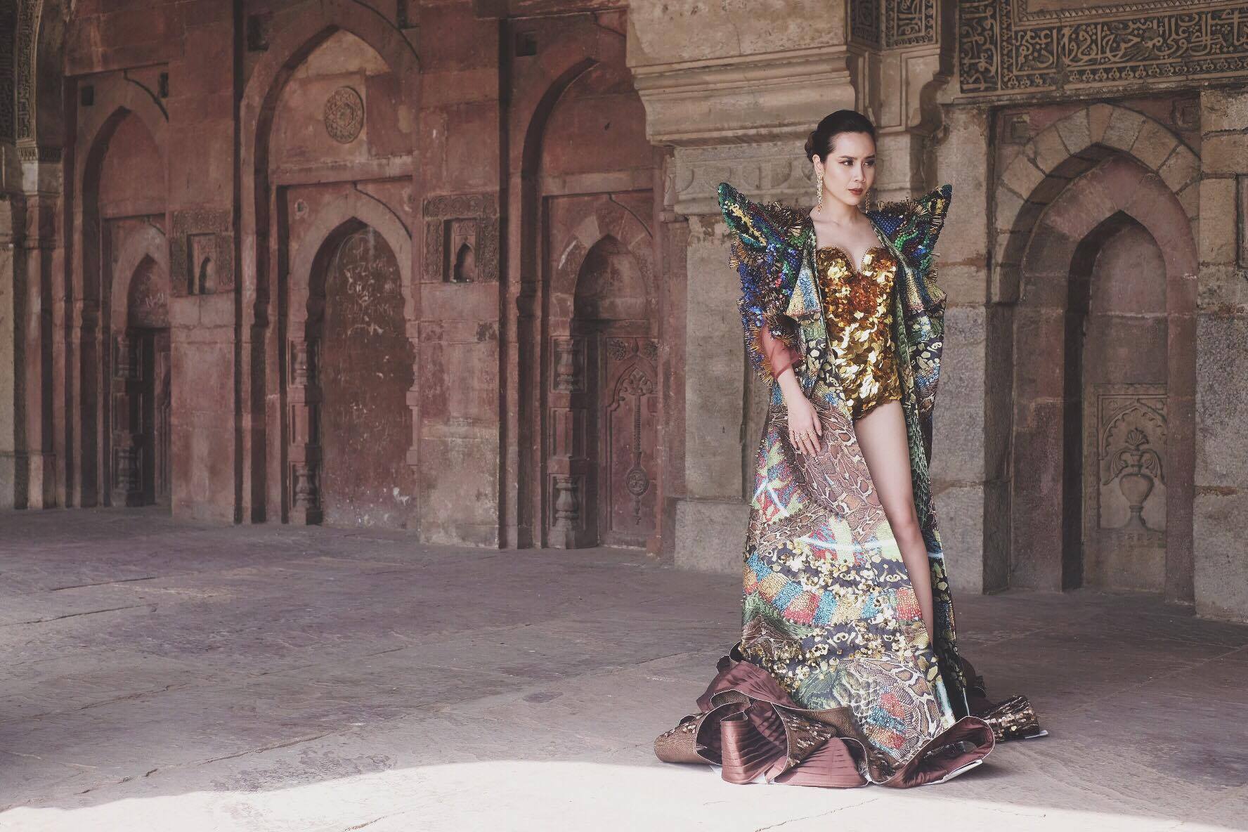 NTK Thủy Nguyễn vốn nổi tiếng với các thiết kế mang màu sắc rất riêng. Sự hài hòa của màu sắc trong trang phục này trùng khớp tuyệt đối với khung cảnh quay tại Ấn Độ.