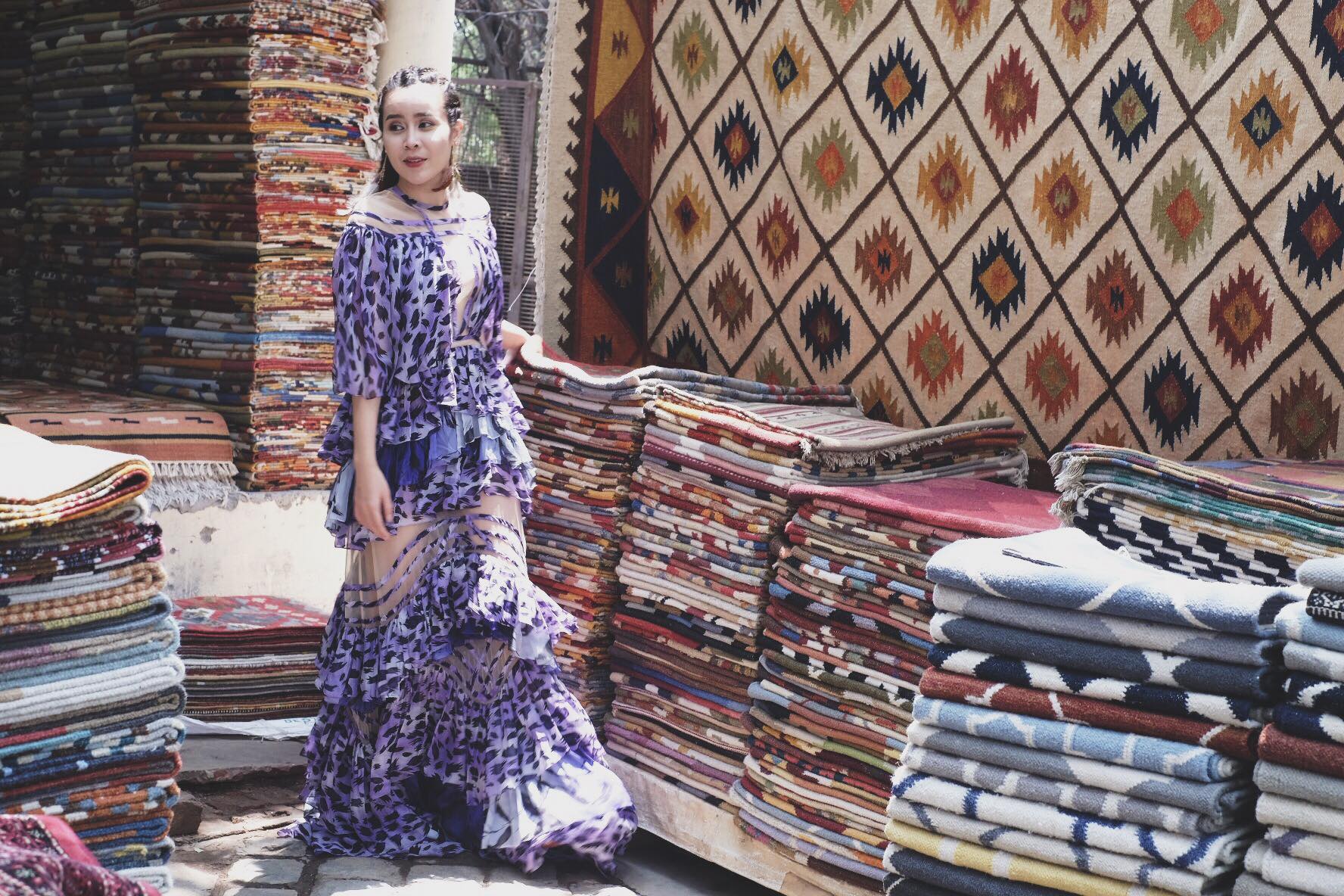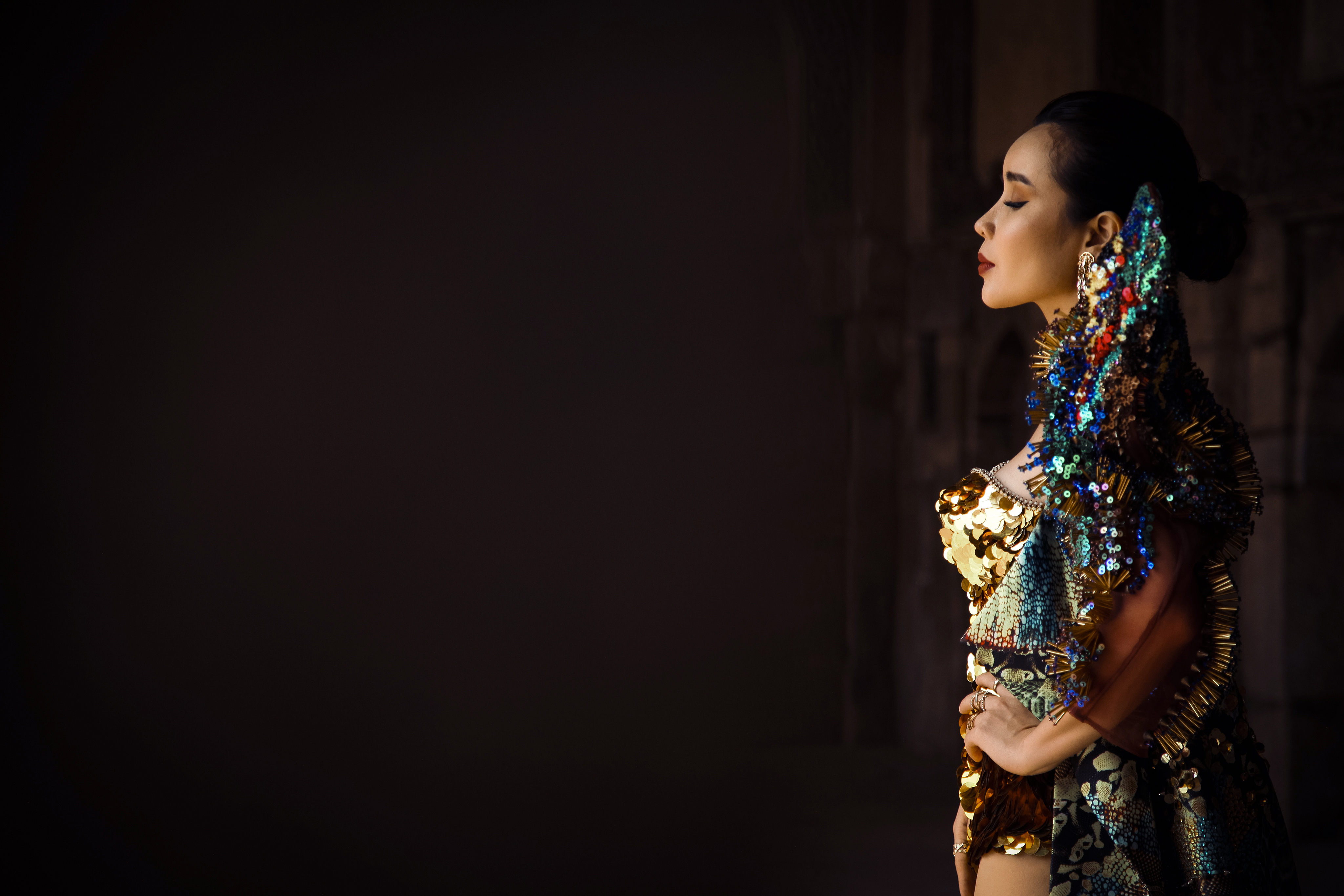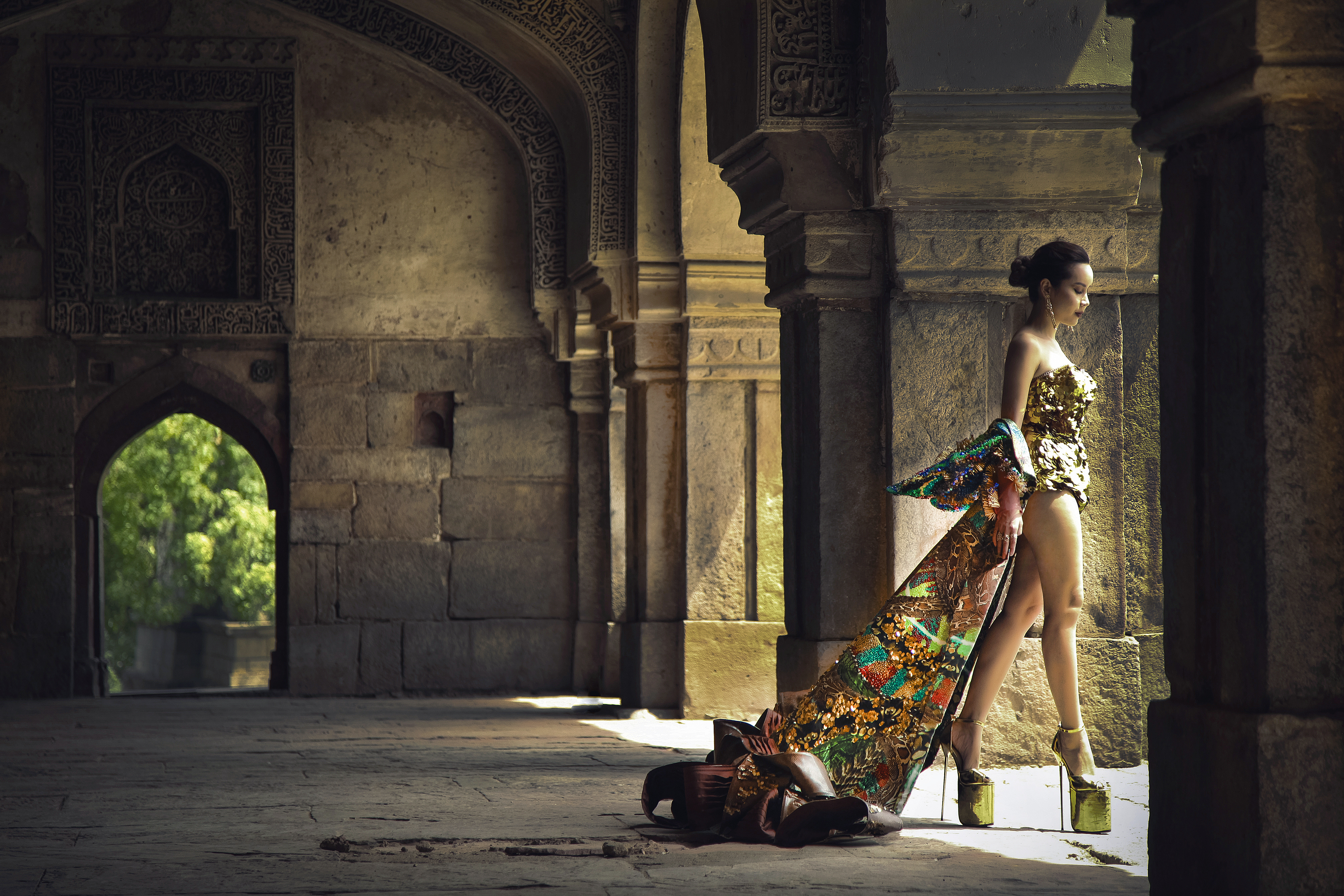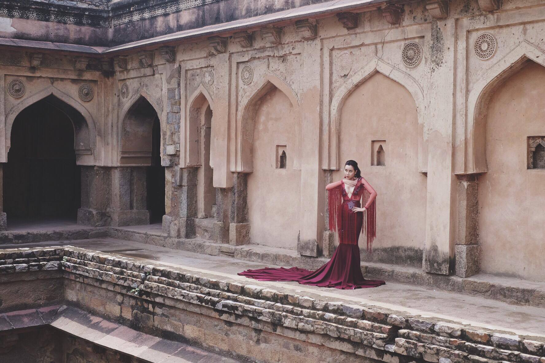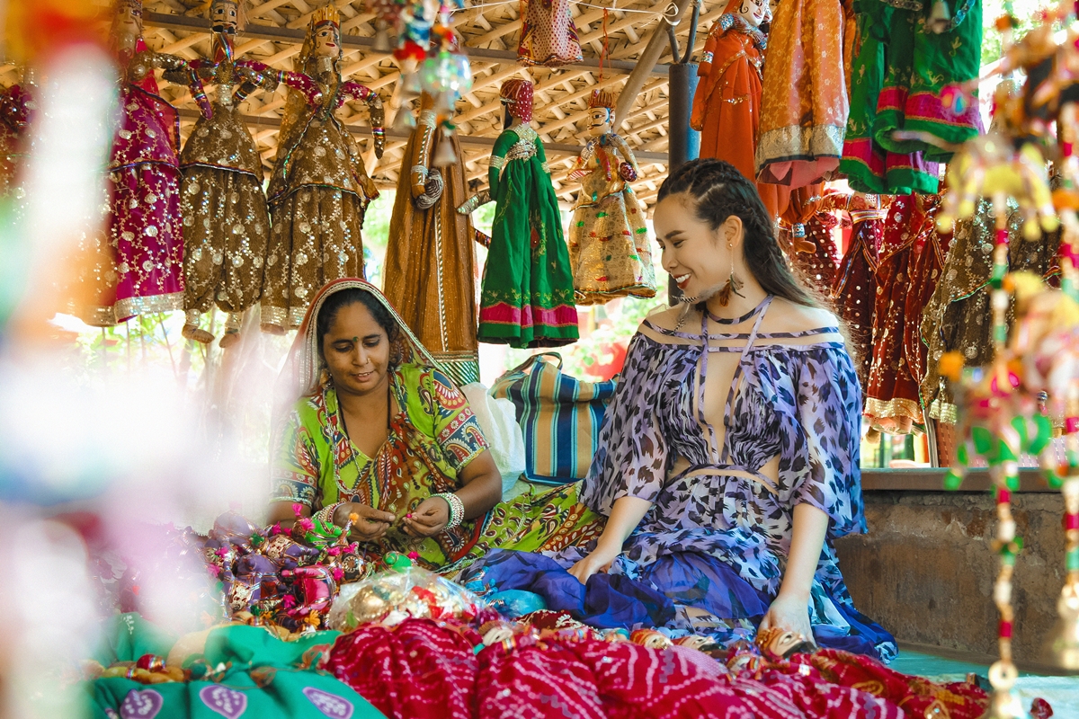 NTK Thủy Nguyễn vốn nổi tiếng với các thiết kế mang màu sắc rất riêng. Sự hài hòa của màu sắc trong trang phục này trùng khớp tuyệt đối với khung cảnh quay tại Ấn Độ.
