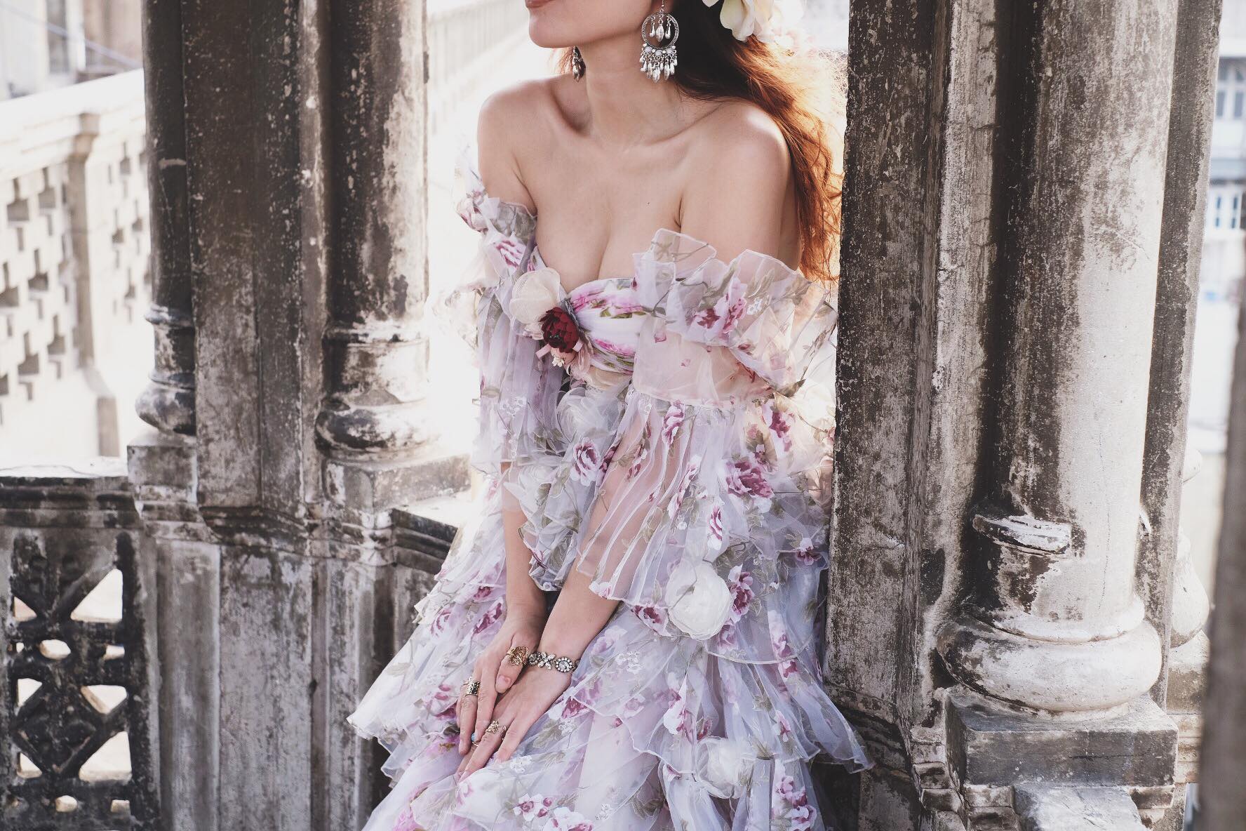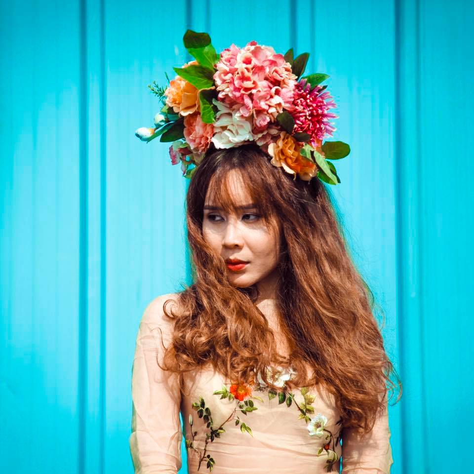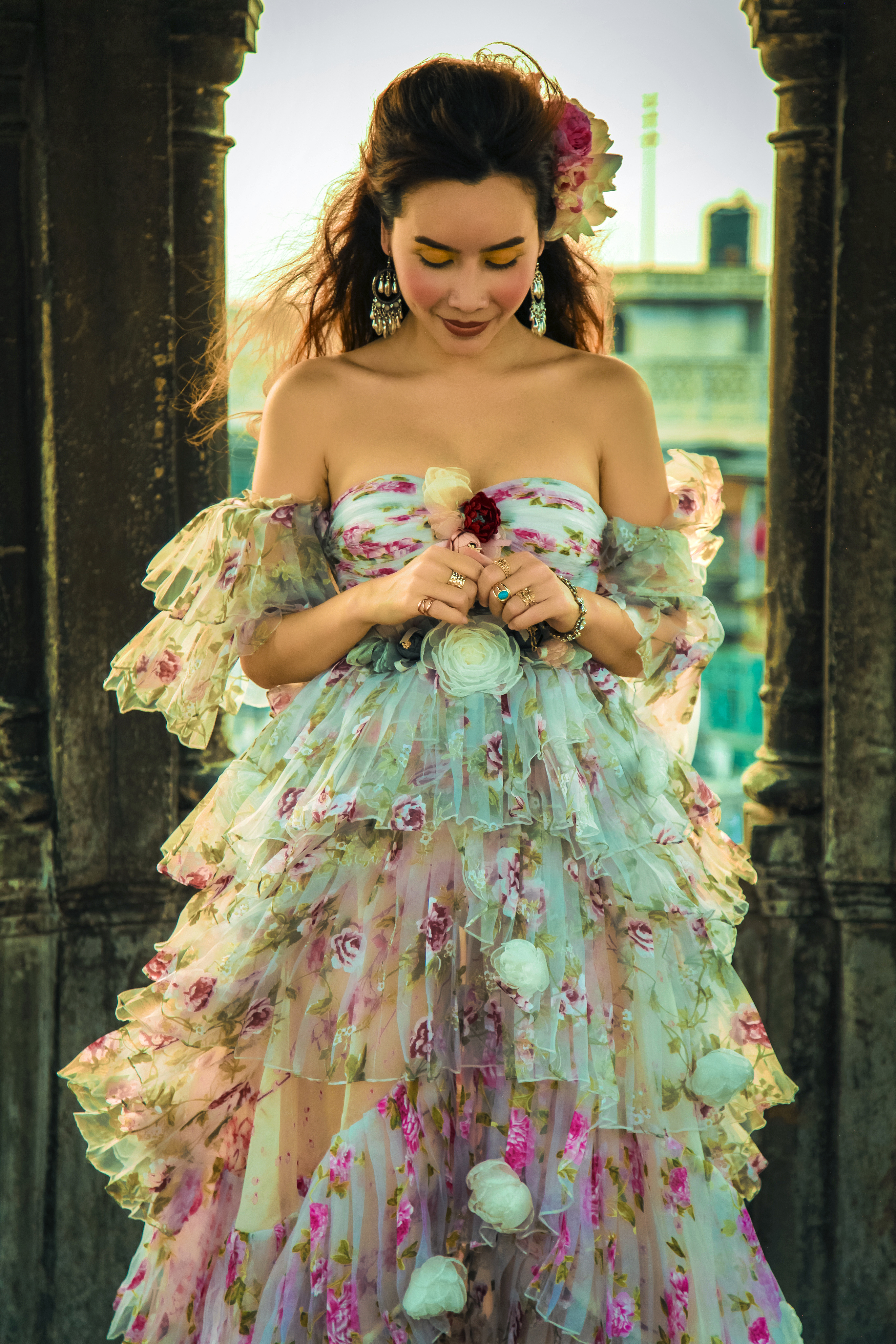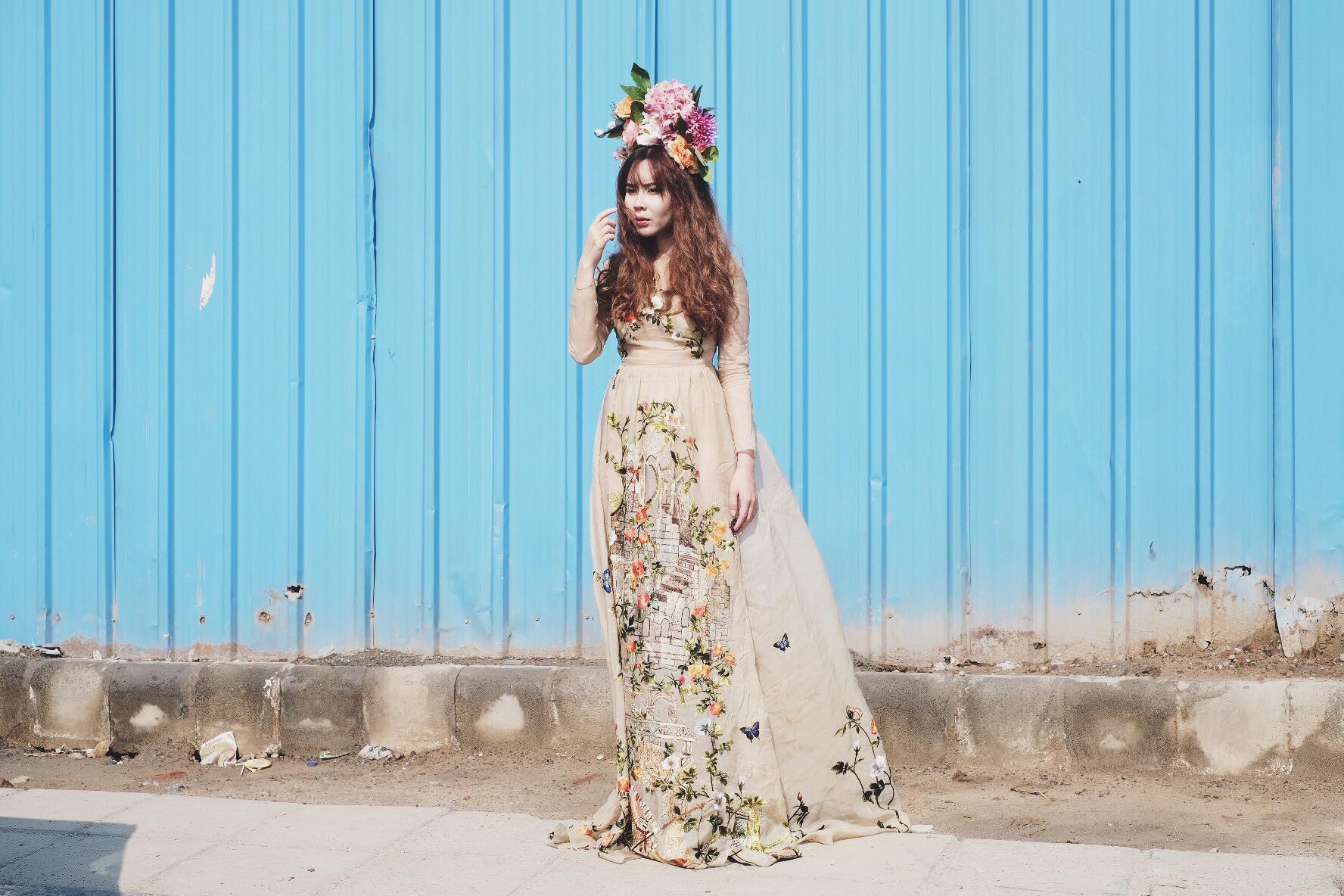 Một rừng hoa được tái hiện trên trang phục từ váy tới phụ kiện đội đầu.