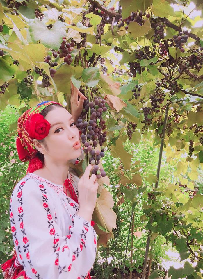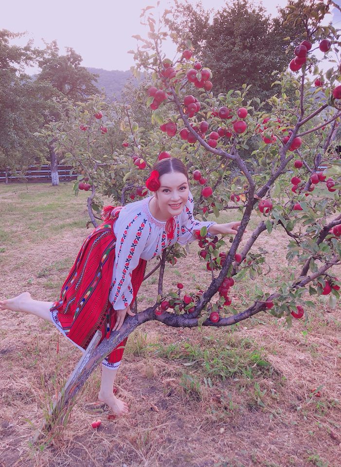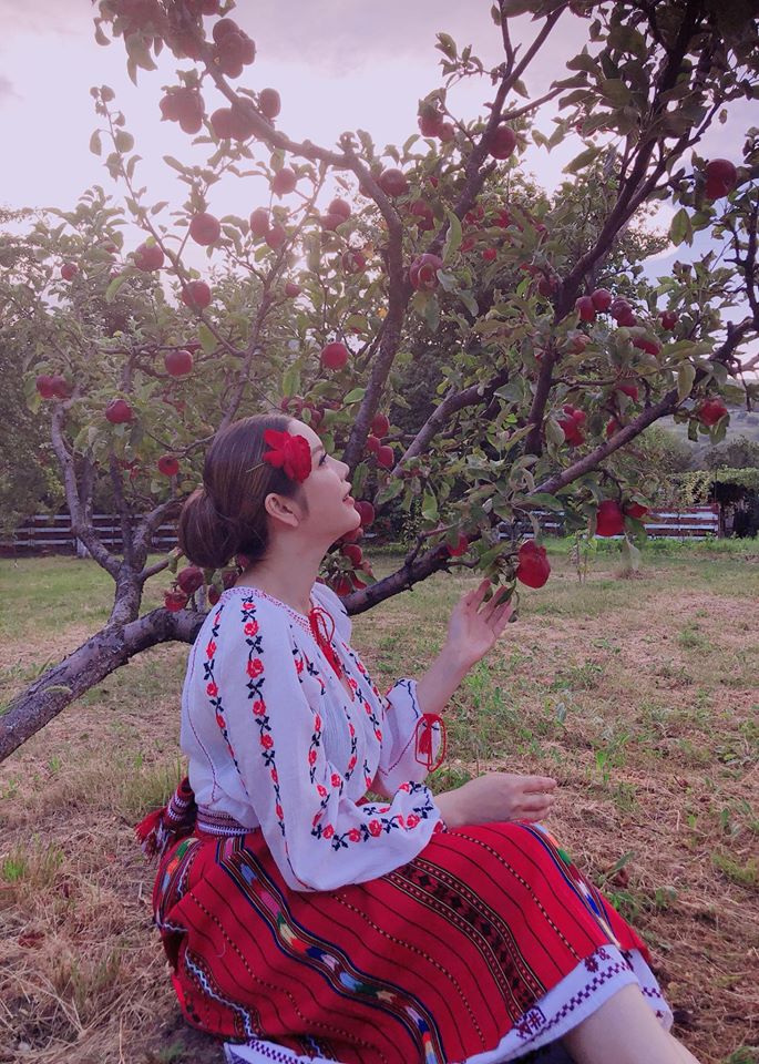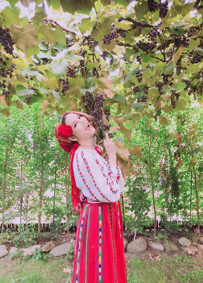 Cô hóa thân vào hình ảnh một cô thôn nữ, với phong cách ăn mặc dân dã, lạc bước vào khu vườn thơ mộng với những vườn cây trĩu quả.
