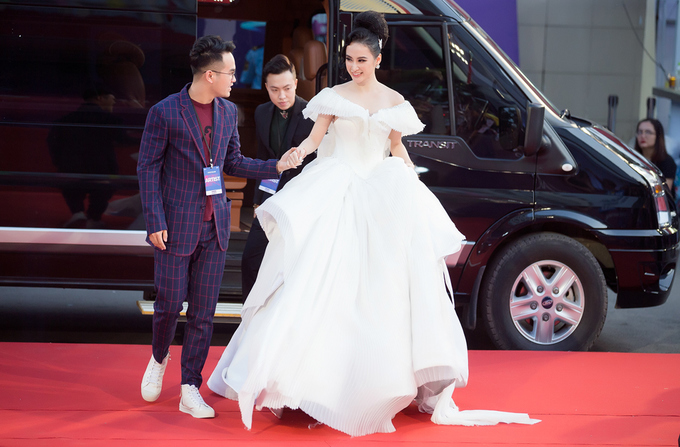 Cũng trên thảm đỏ MAMA, Angela Phương Trinh diện đầm trắng xòe, phát sáng. Chiếc váy khá rộng, thiết kế cầu kì, tuy nhiên Angela Phương Trinh di chuyển một cách khéo léo, tinh tế và không để xảy ra bất cứ sự cố nào.