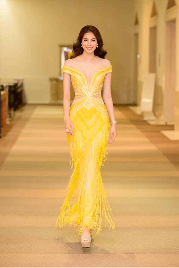 Trong sự kiện tại Nhật Bản, Phạm Hương diện bộ váy dạ hội tua rua của NTK Lê Thanh Hòa. Bộ váy vàng rực rỡ được nhà tạo mốt Việt thực hiện riêng cho Phạm Hương, giúp cô khoe tối đa hình thể quyến rũ.