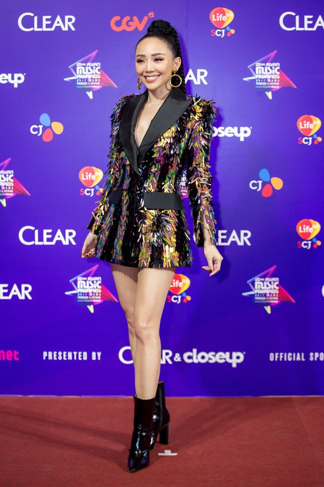 Xuất hiện trên thảm đỏ MAMA, Tóc Tiên gây chú ý với bộ trang phục lấp lánh, cá tính của NTK Công Trí. Nữ ca sĩ thu hút mọi ánh nhìn khi sải bước trên thảm đỏ nhà hát Hòa Bình.
