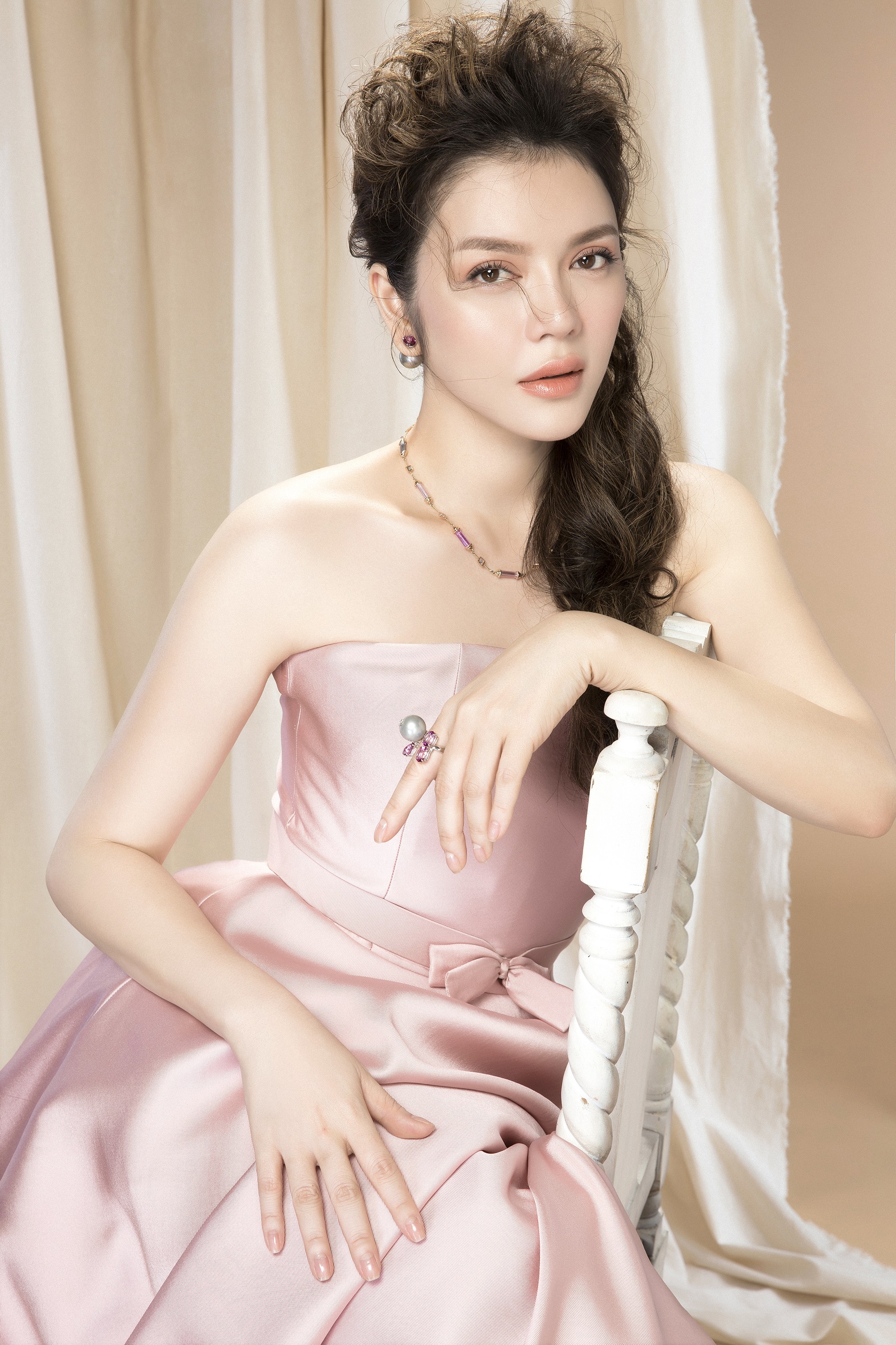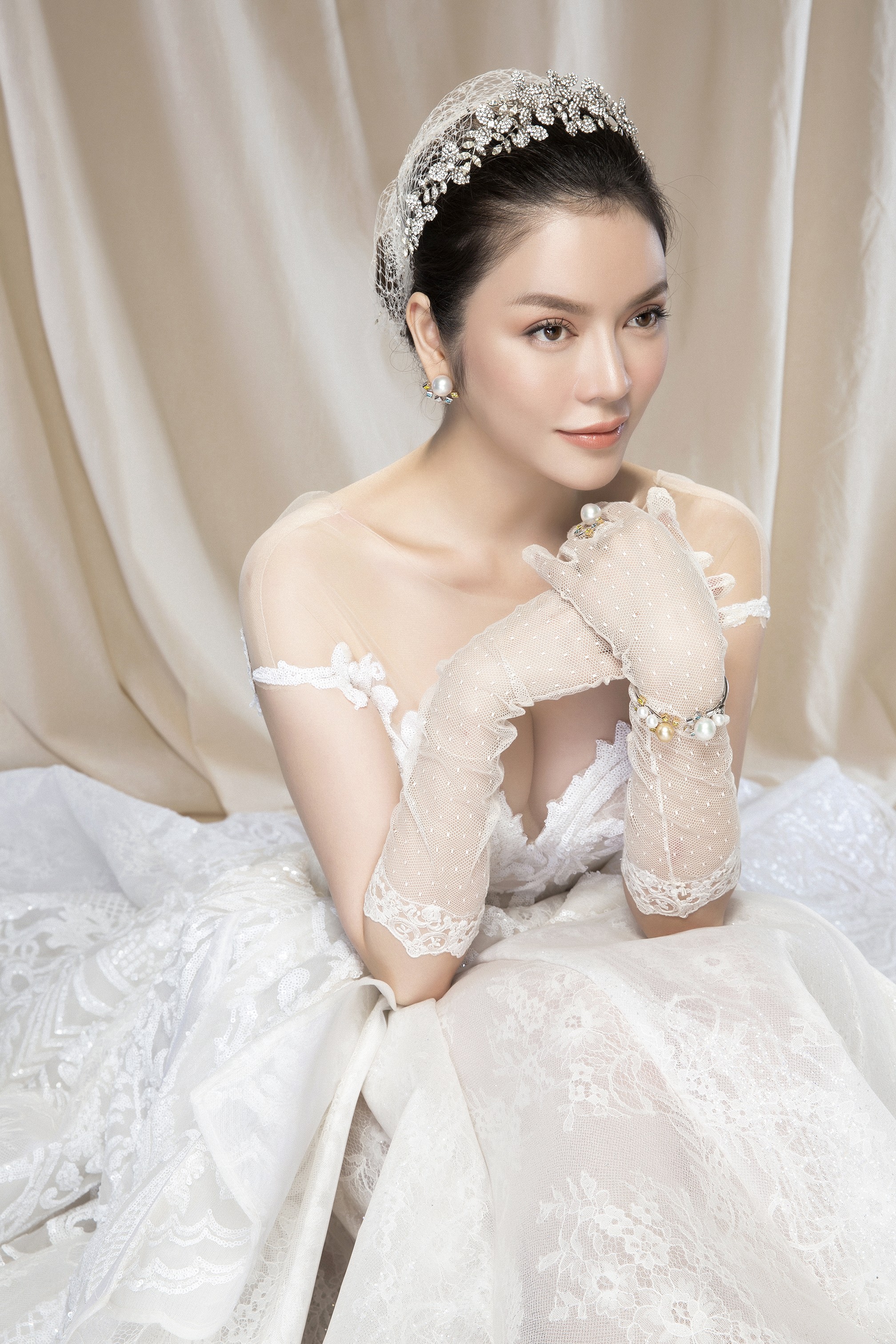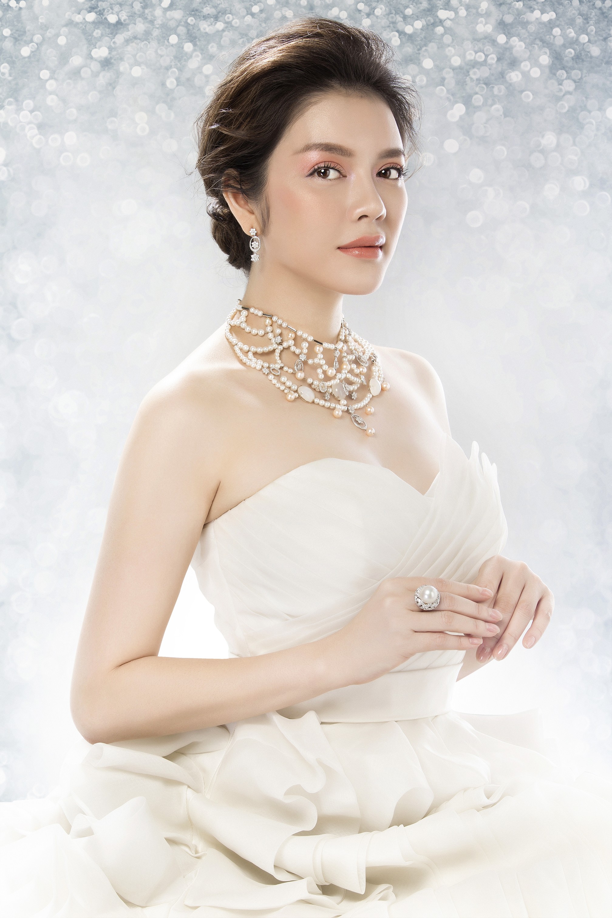 Lý Nhã Kỳ tô điểm cho vẻ đẹp tinh khiết vẹn nguyên của mình cho chiếc váy trắng thêm lộng lẫy bằng những sợi dây chuyền mỏng manh, những đôi khuyên tai nạm đá và kim cương lấp lánh, những chiếc lắc, vòng tay bằng ngọc trai tạo nên vẻ đẹp trong sáng nhưng không kém phần lộng lẫy kiêu kỳ.