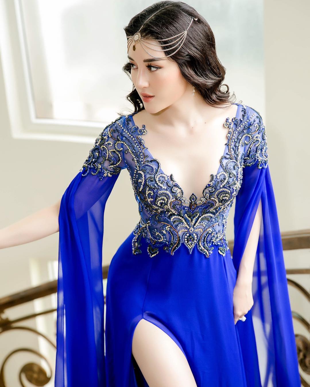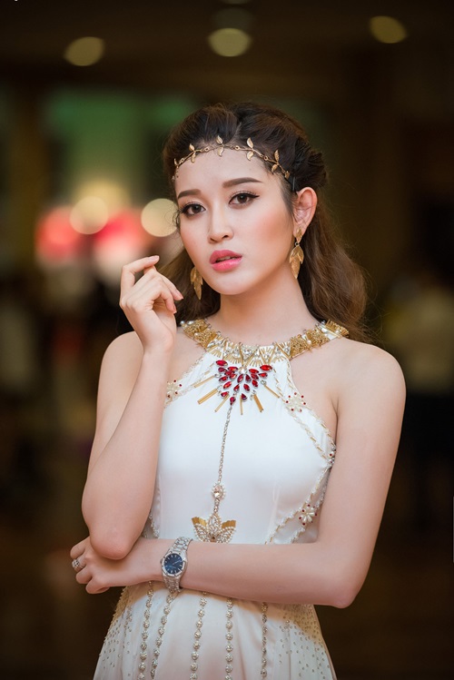 Hết hóa nữ thần Ấn Độ, sang hóa thành nữ thần Hy Lạp với chiếc vòng nguyệt quế bé tý teo. Có thể thấy Huyền My đích thị là chân dài chăm đeo phụ kiện trên đầu nhất.