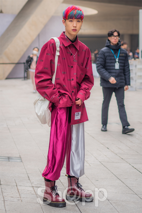 Một chiếc quần chất liệu vải lụa bóng mềm mại mix cùng áo sơ mi đỏ và chiếc boots tông xuyệt tông, mái tóc xanh đỏ như tăng thêm độ nổi cho anh chàng này.