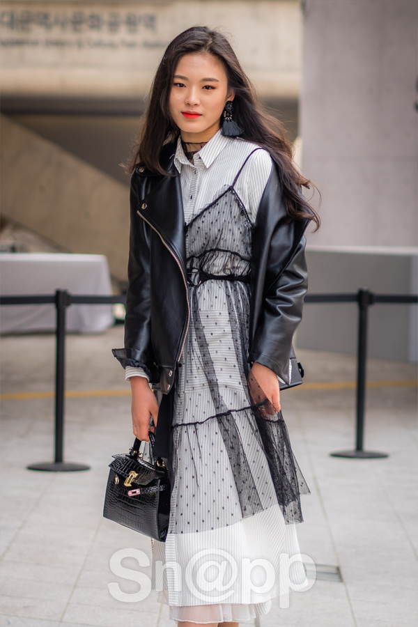 Thêm một gợi ý thú vị nữa cho các cô nàng khi có thể học hỏi cách mix layer váy dáng áo sơ mi với một chiếc váy ngủ trong suốt và jacket da. Vừa mềm mại vừa cá tính, hòa quyện khá nhịp nhàng khi được mix cùng nhau.