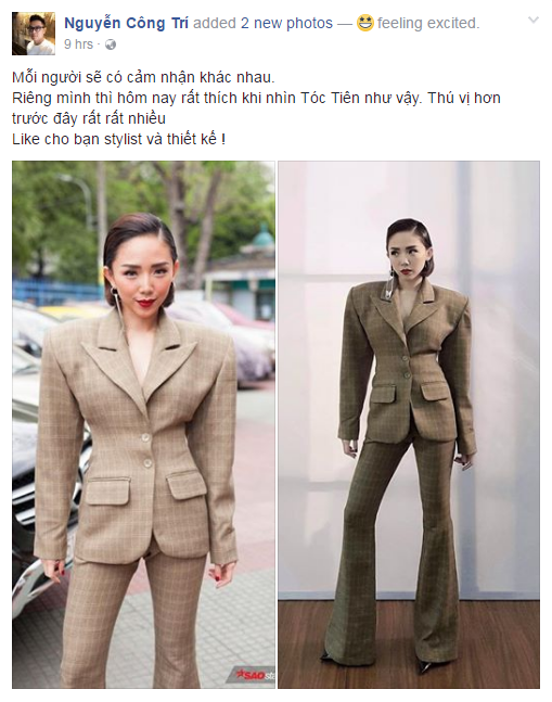 Ngược dòng tranh cãi về bộ suit trông có vẻ lạ đời, nhà thiết kế Công Trí đã chính thức nói lên suy nghĩ cá nhân của mình. Không quá dài dòng, chủ nhân bộ sưu tập Em Hoa chỉ đơn giản đồng tình Tóc Tiên trong bộ trang phục thú vị hơn anh thấy trước đây “rất rất nhiều”. Đứng trên cương vị thiết kế, “mỗi người sẽ có cảm nhận khác nhau” nhưng Công Trí cho biết, anh tin vào con mắt nghề nghiệp của mình.