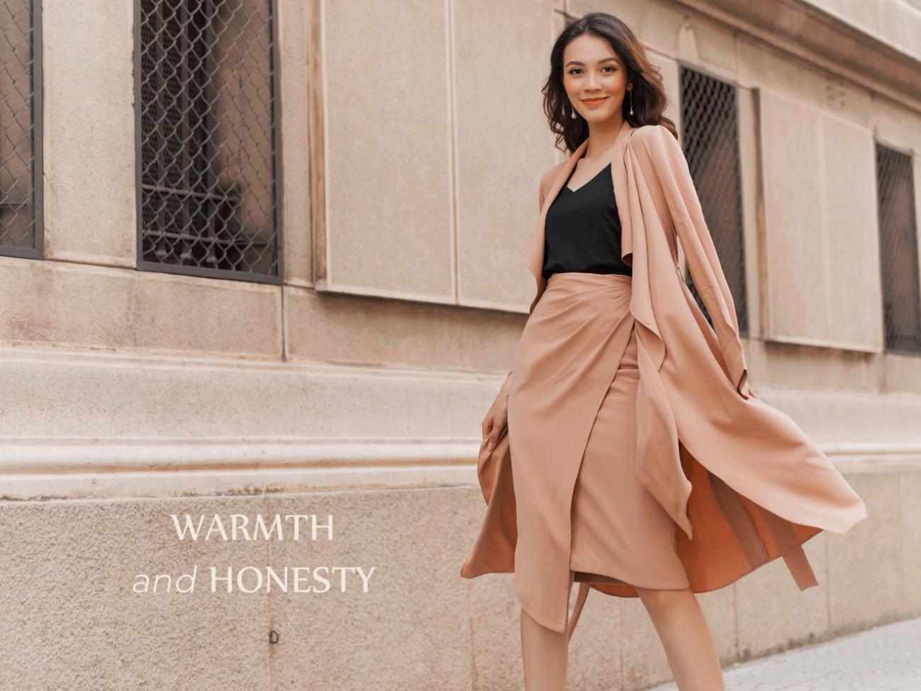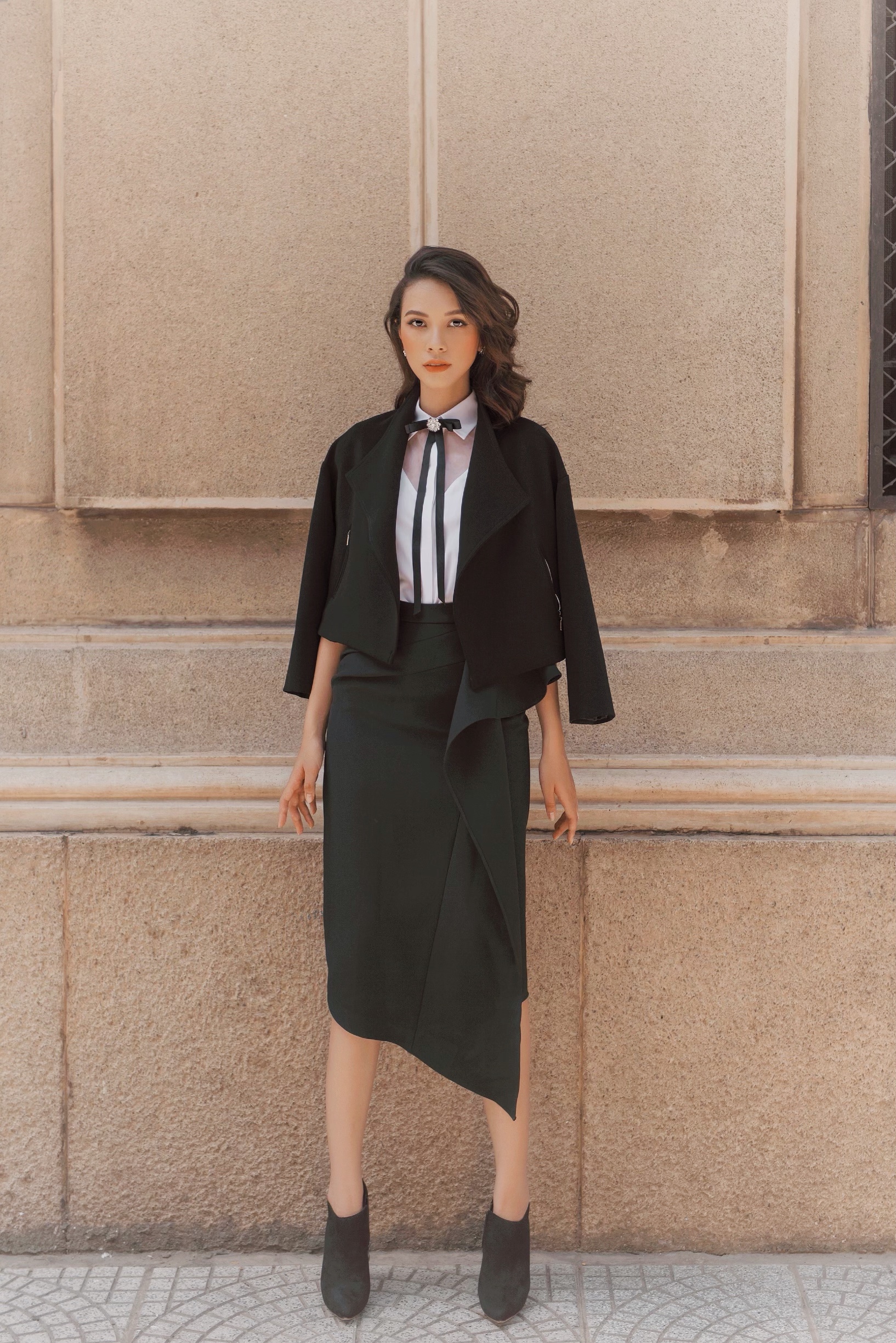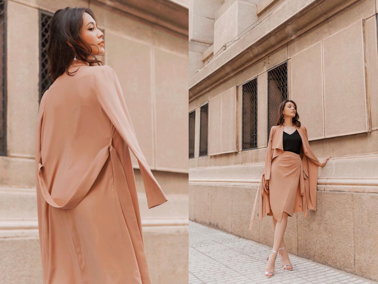 Set đồ chân váy đen vạt xéo và áo khoác lửng cũng là gợi ý hoàn hảo cho nàng công sở đón thu.