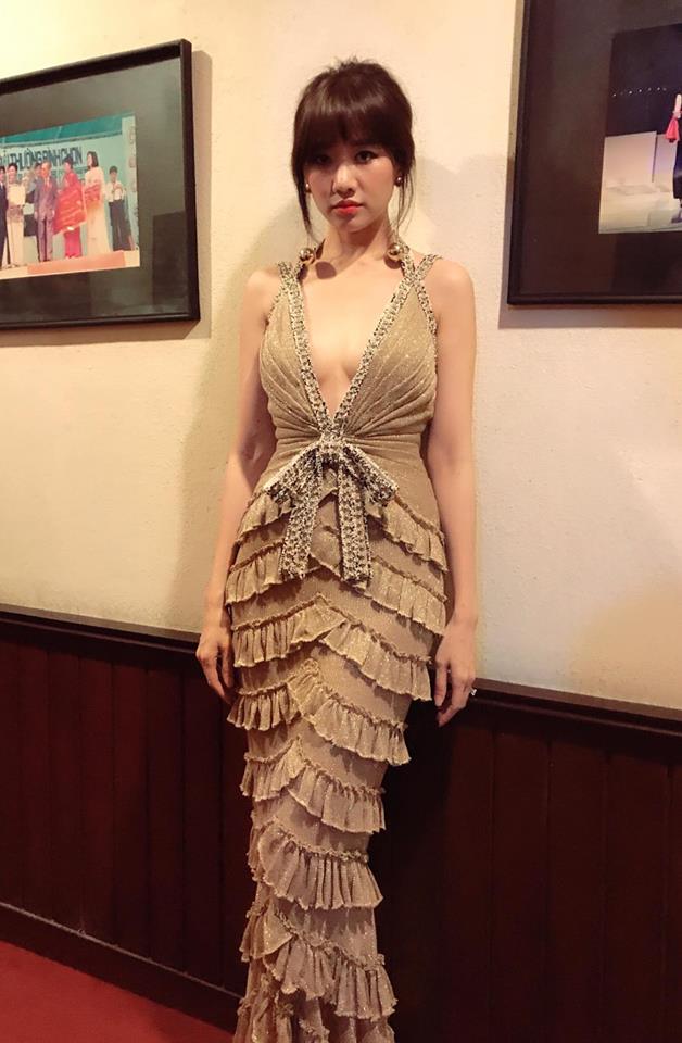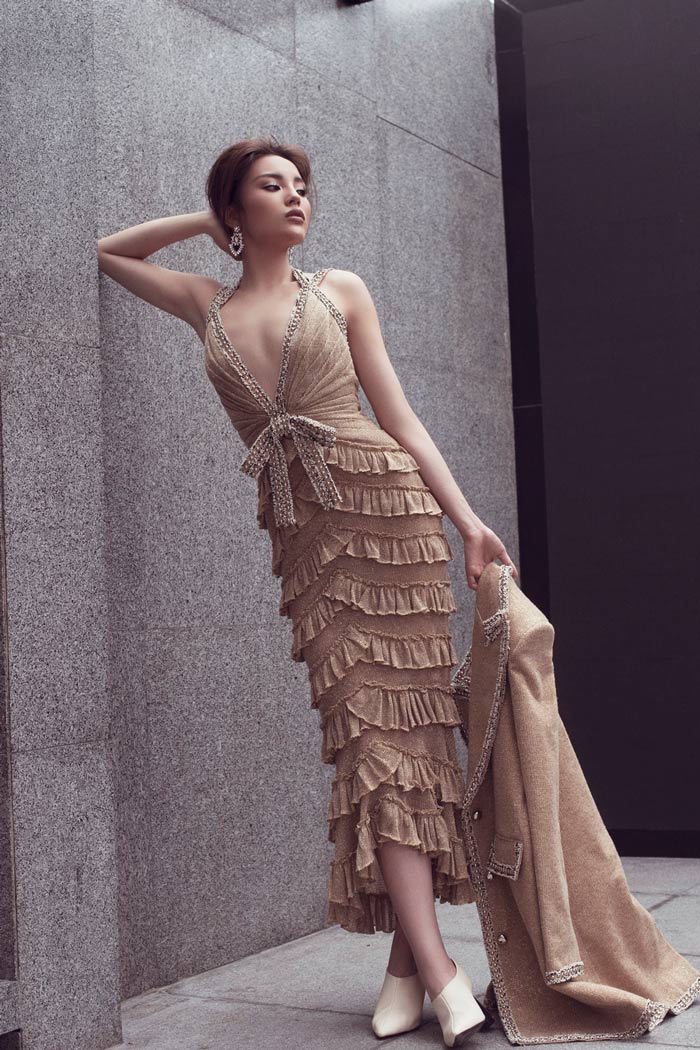 Minh Triệu cũng có lần mặc thiết kế này, mặc đầm bèo nhún tầng khoét cổ sâu gợi cảm đến thế nhưng trông cô vẫn vô cùng cá tính.