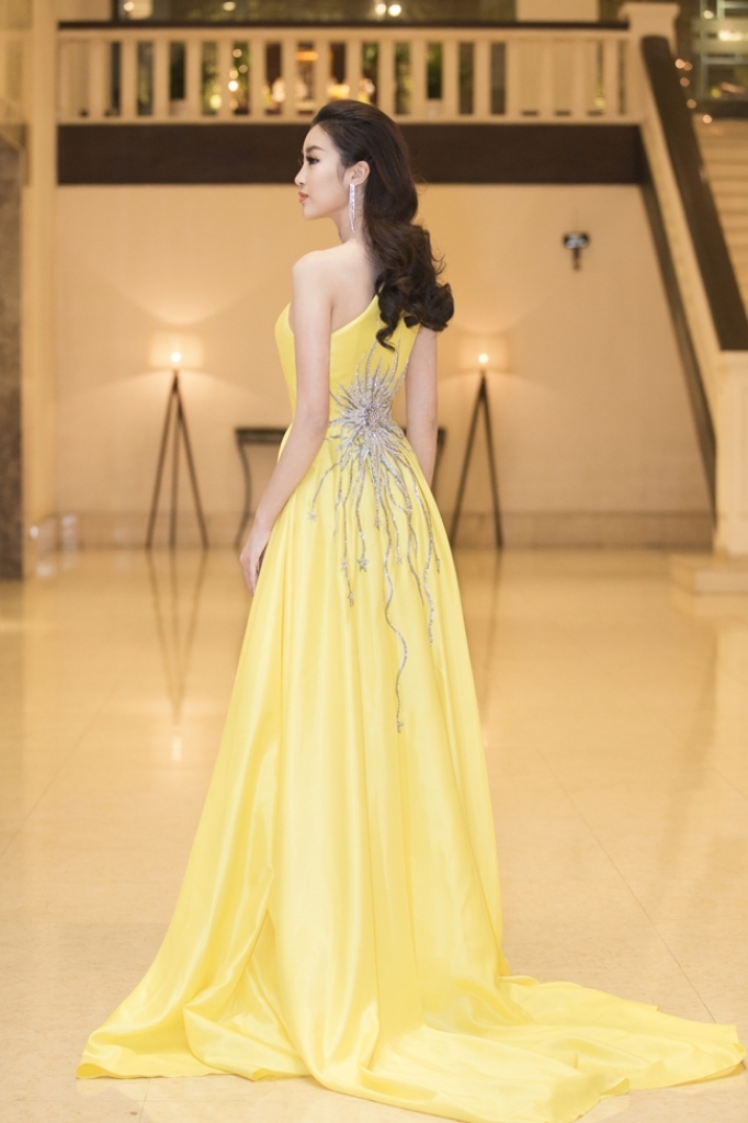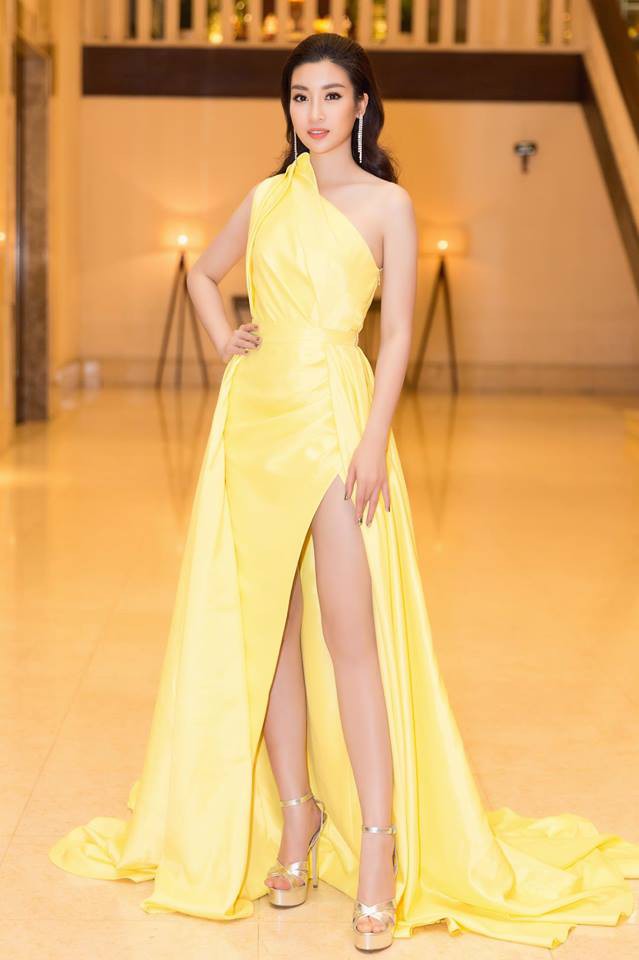 Trái ngược với người đẹp đến từ Nga, đương kim Hoa hậu Việt Nam Đỗ Mỹ Linh xuất hiện rạng rỡ như nữ thần với chiếc đầm vàng lệch vai tại sự kiện giải thưởng âm nhạc Keeng Young Awards diễn ra vào hồi đầu năm 2018. Đây là bộ váy đặc biệt được NTK Lê Thanh Hòa thiết kế riêng cho cô.