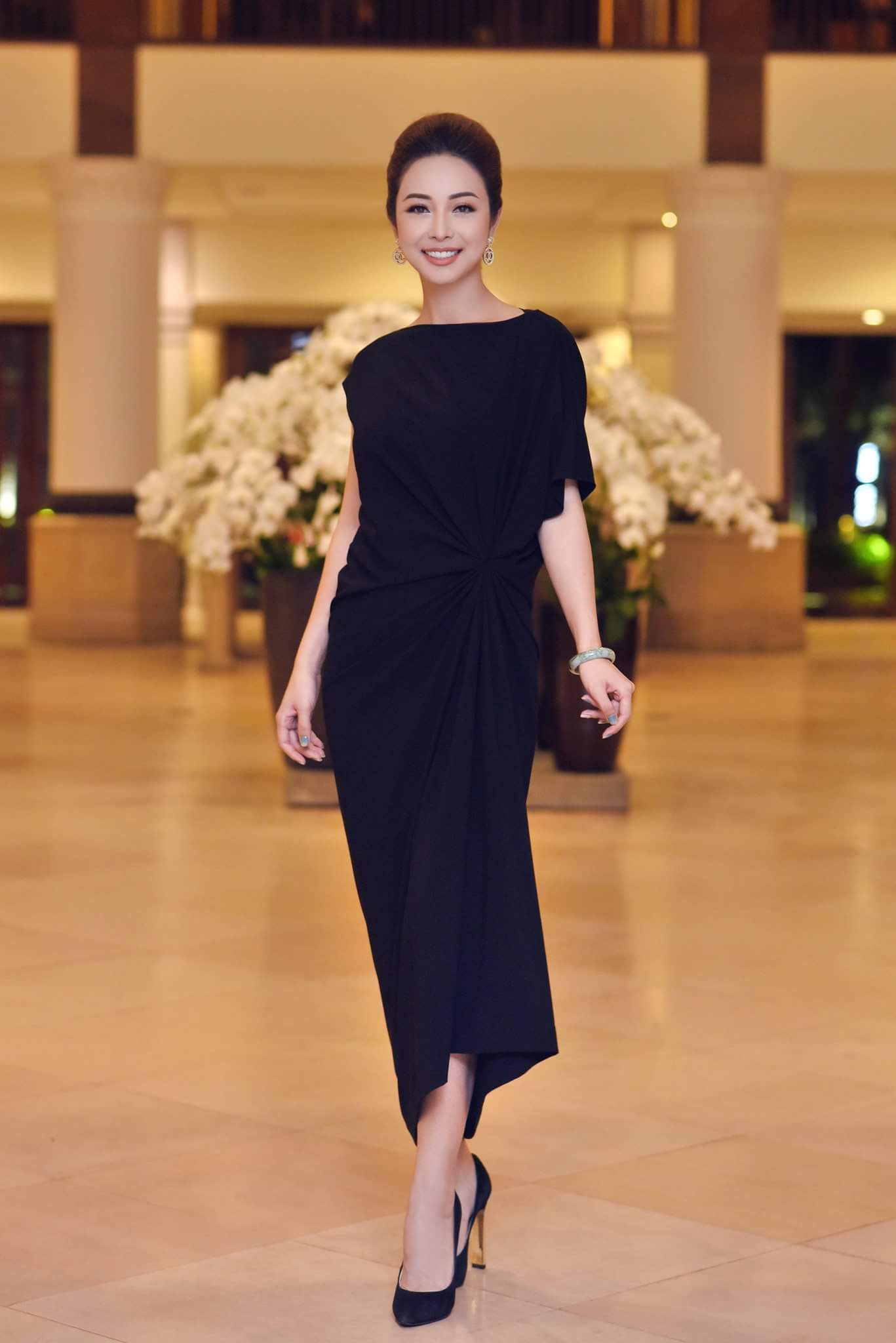Trái ngược với Ngọc Duyên, Jennifer Phạm lại lựa chọn sắc đen cùng phom dáng suôn rộng để khoe nét yêu kiều trên thảm đỏ.