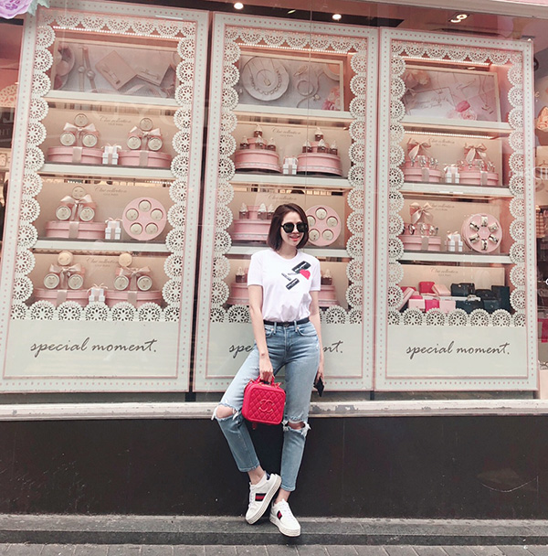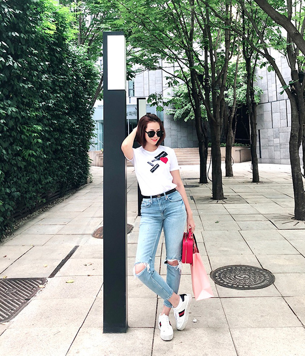 Quần jeans rách gối màu basic cạp cao luôn khiến chân bạn như dài ra mà tuổi của bạn lại như “ngắn” đi