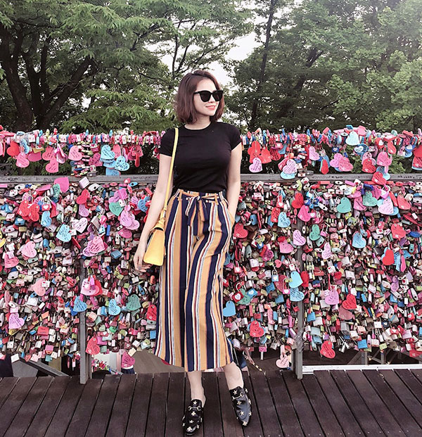Một chút nữ tính và điệu đà với quần suông ống lỡ và áo thun đen đơn giản