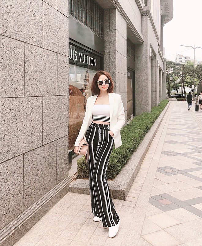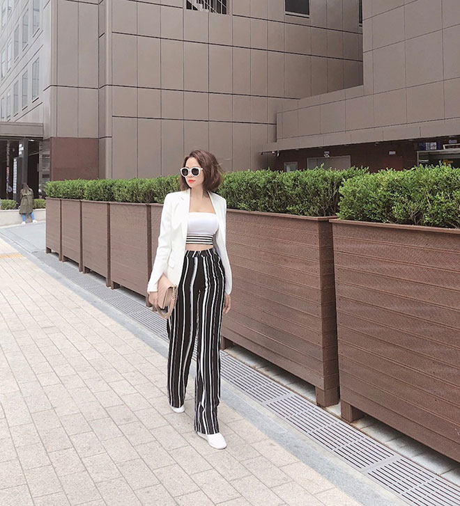 Và nếu muốn sang chảnh thì ngay lập tức hãy mix đồ theo công thức áo blazer + quần suông kẻ sọc và áo crotop