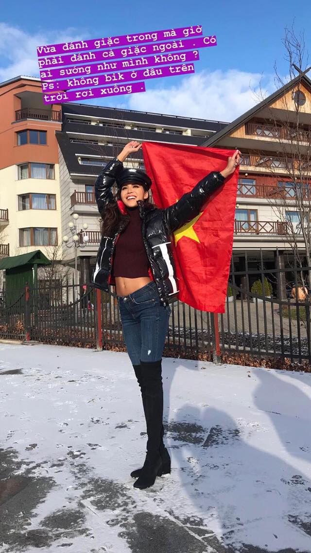 Cô vẫn lạc quan, tập trung cho phần thi sắp tới, đưa màu cờ Việt Nam sánh vai với quốc gia năm châu.