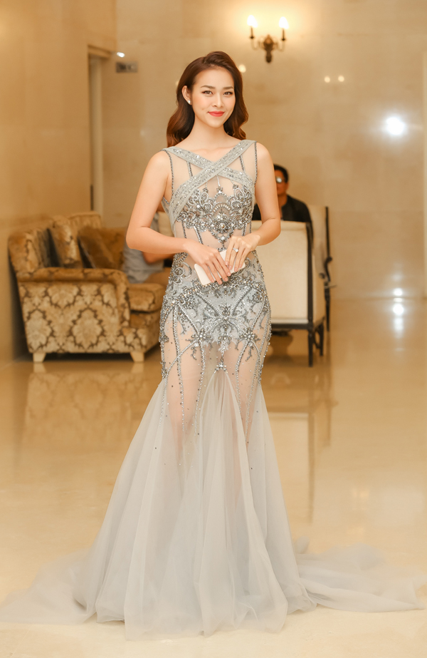 Chiếc váy có gam màu nude nhẹ nhàng cùng những đường cắt cúp, đính kết tinh tế giúp người mặc khoe trọn số đo hình thể mà không hề phản cảm.