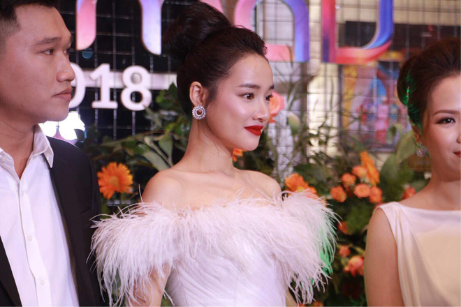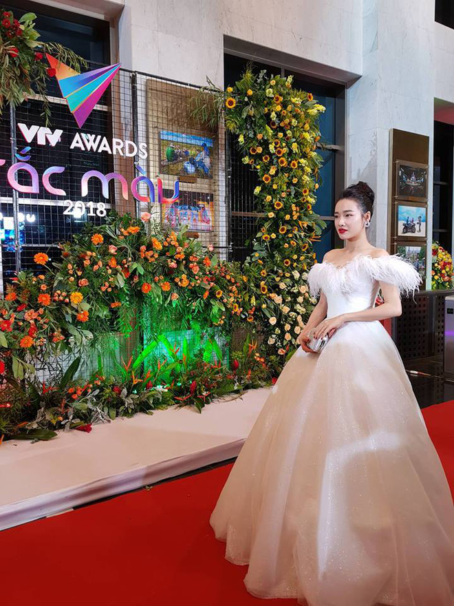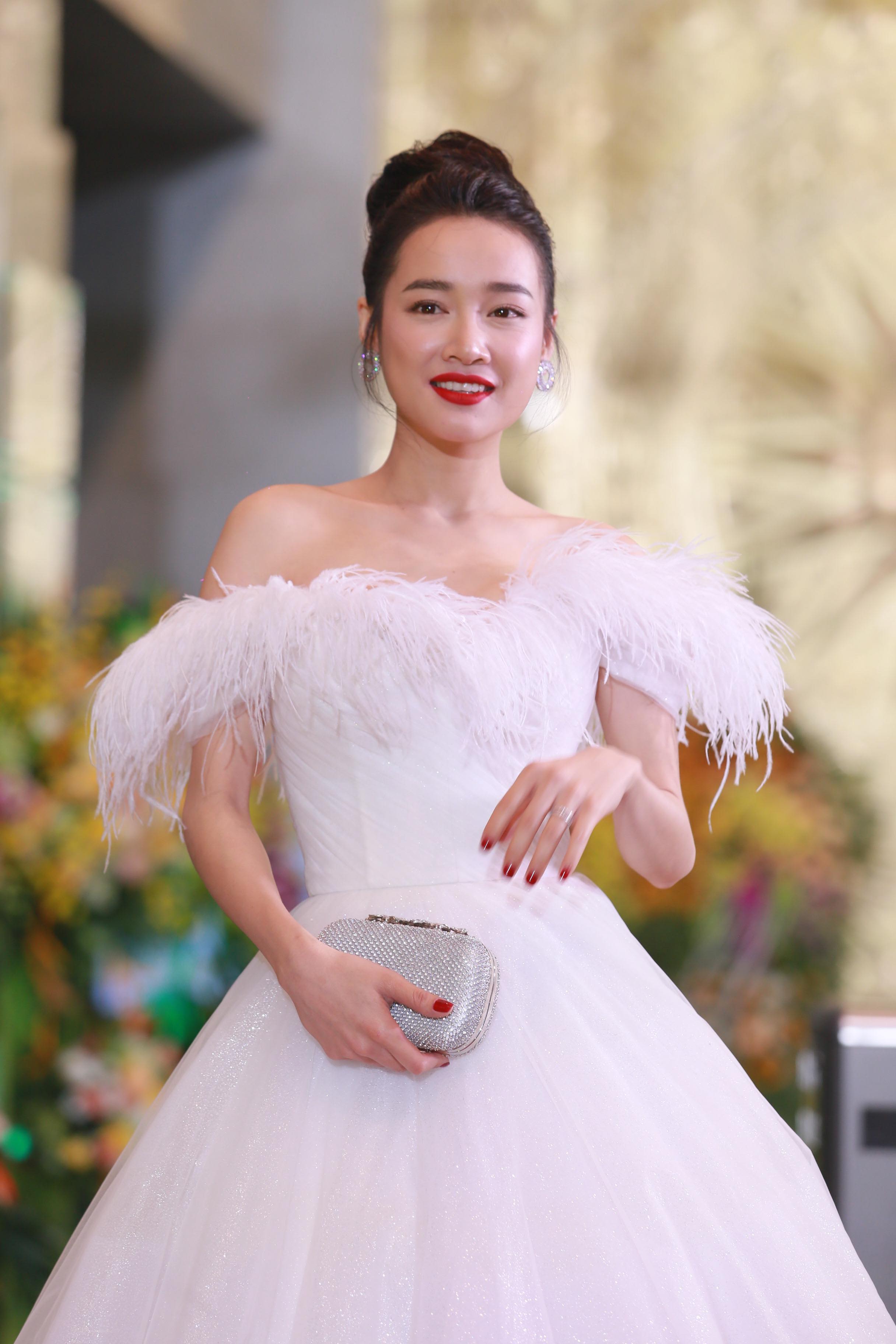 Nhã Phương xinh đẹp với thiết kế đầm dạ hội trễ vai đính lông vũ màu trắng ngần tôn lên vẻ đẹp tinh khôi, dịu dàng vốn có của cô.