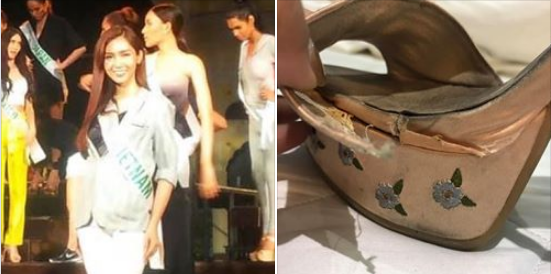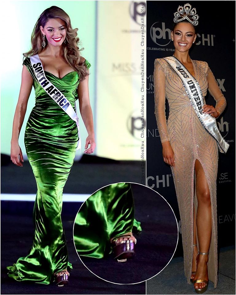 Tuy không gặp sự cố về váy áo, nhưng cựu Miss Universe 2017 - Demi-Leigh Nel-Peters cũng gặp rắc rối không nhỏ khi trong đêm thi Bán kết giày của cô đã bị đứt. Rất may mỹ nhân Nam Phi đã xử lý khá tốt để hoàn tất phần thi của mình một cách trọn vẹn nhất.