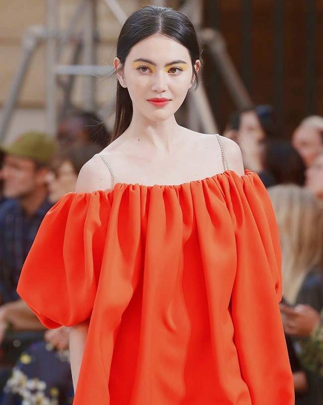 Tone makeup ngọt ngào với điểm nhấn màu vàng chanh trên mắt , cô khoác trên mình chiếc váy Nicolas Lecourt Mansion màu cam san hô, tông màu chủ đạo trong năm 2019