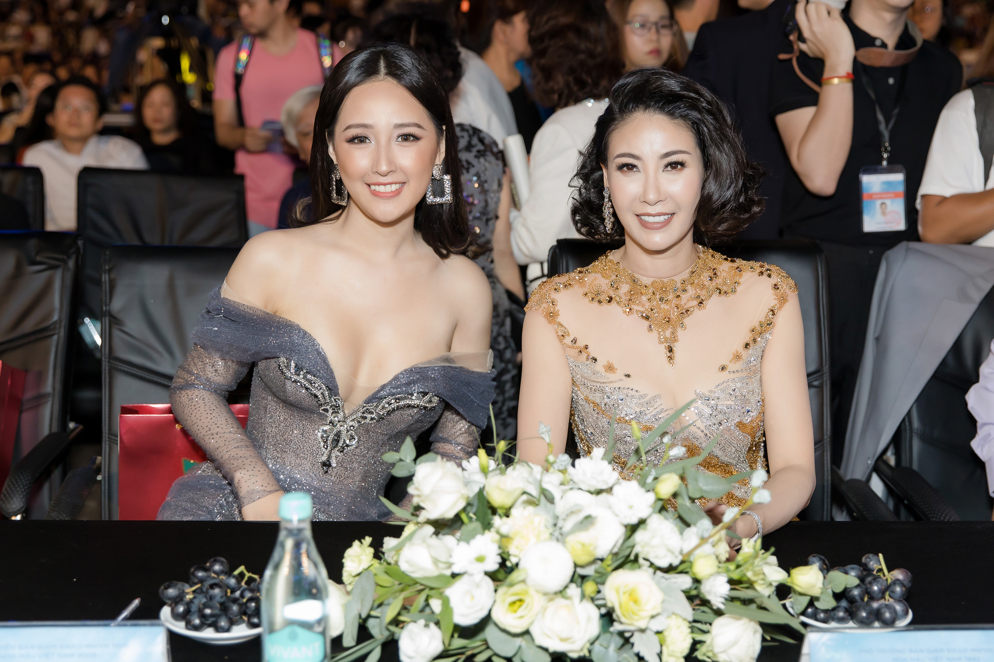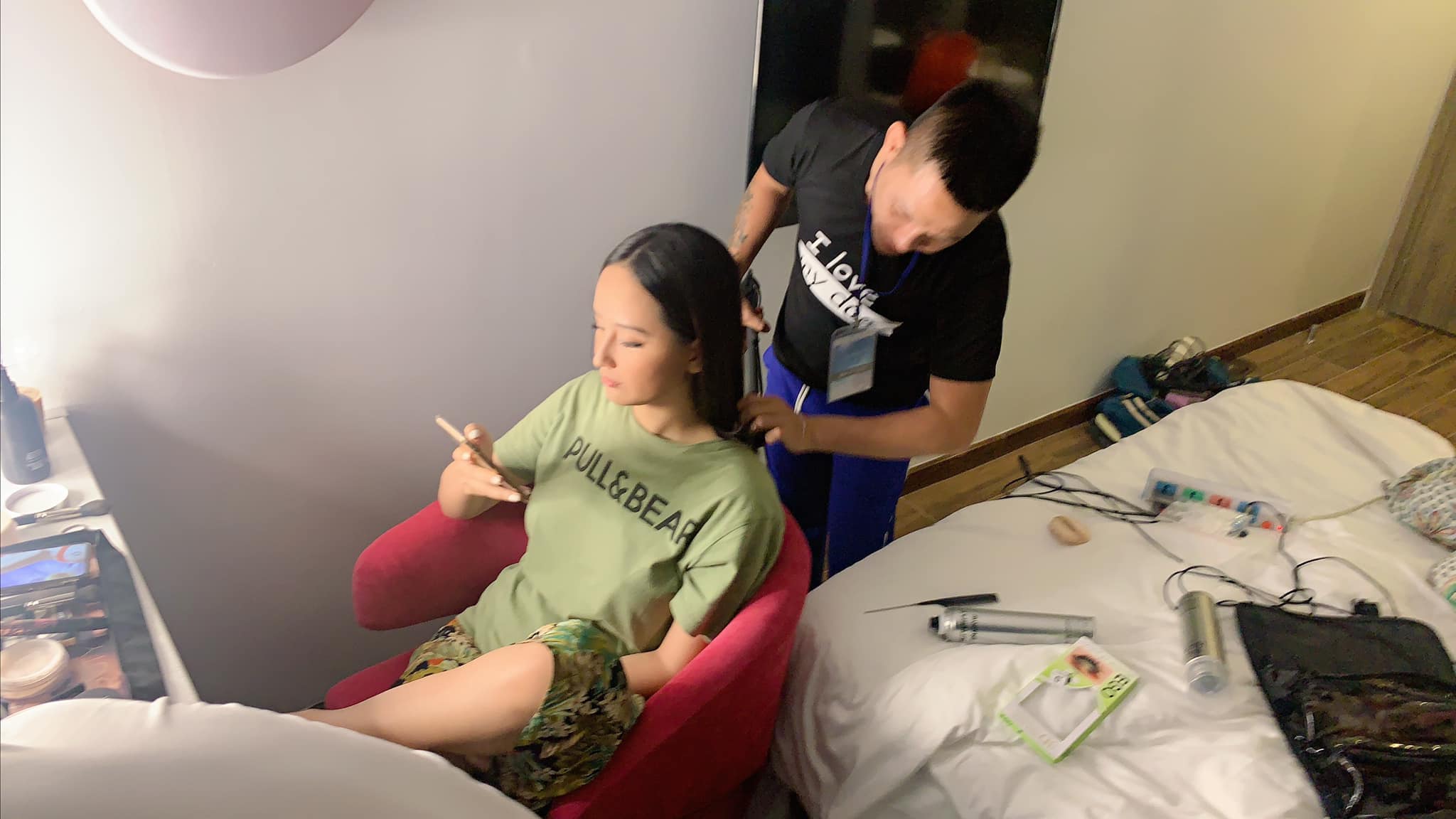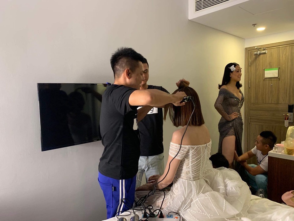 Để có diện mạo chỉn chu cô đã được đội ngũ hậu cần chăm sóc trước đó vài tiếng. Đi theo cô luôn có chuyên gia make up ruột là Phúc Nghĩa
