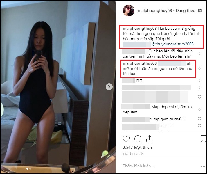 Phía dưới phần bình luận, Mai Phương Thúy cho biết việc tăng cân diễn ra trong khoảng một tuần qua. Nguyên nhân được người đẹp xác nhận là do ăn mì gói liên tục.