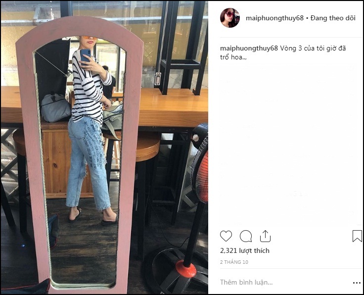 Trước đó không lâu, Mai Phương Thúy đăng tải bức ảnh khoe thân hình tròn trịa hơn thường thấy với góc ảnh phía sau. Vòng 3 rất “khủng” của cô khiến người hâm mộ phải ngỡ ngàng.