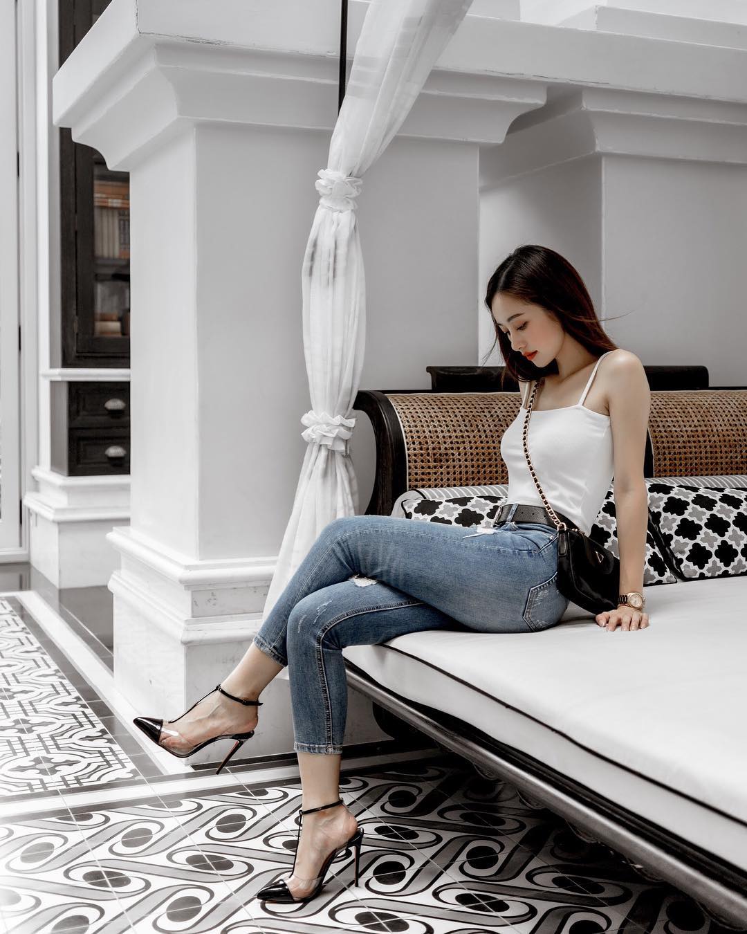 Sau khi dao kéo vòng 1, Jun Vũ thường lựa chọn những bộ cánh ôm sát, khoe trọn đôi gò bồng đào, tuy nhiên, cách cô nàng lựa chọn trang phục cũng rất tinh tế, đơn cử như set đồ gồm áo hai dây và quần jeans ôm này.