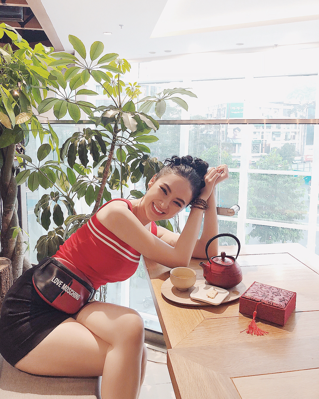 Hoàng Thùy “chống chọi” cùng cái nắng mùa hè với combo quần short cực ngắn cùng áo croptop khoe eo.