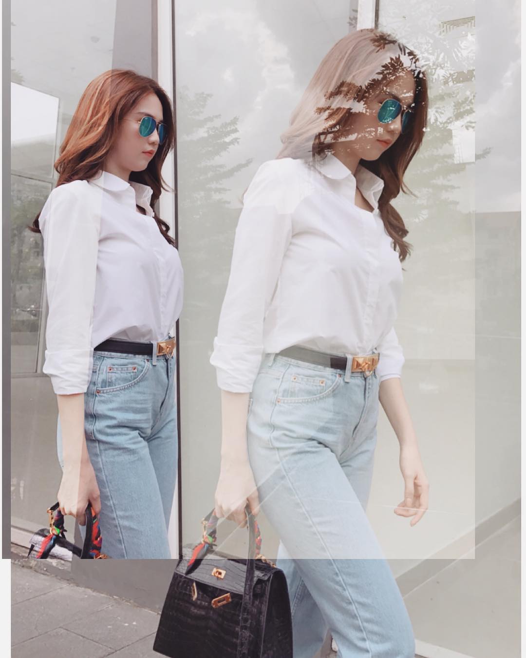 Chán chê váy, áo hai dây, Ngọc Trinh thay đổi phong cách với áo sơ-mi trắng cùng quần jeans ôm khoe dáng, tuy đơn giản nhưng cực kỳ hút mắt.