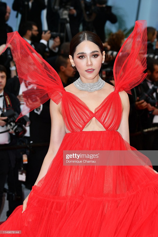 Nàng mẫu kiêm diễn viên đình đám xứ Thái chọn cho mình thiết kế váy đỏ lạ mắt với hai cái nơ che lấp ló vòng 1