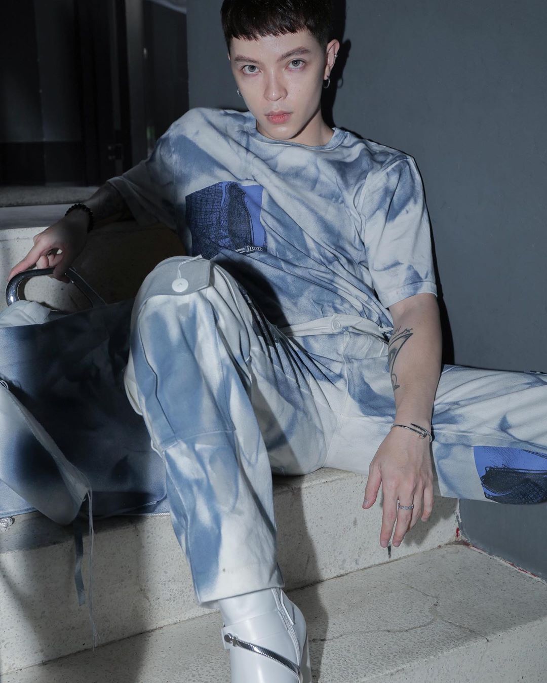 Cùng là mẫu quần đó, nhưng Kelbin Lei lại có cách mix cùng áo theo style cả cây, mang lại sự nổi bật, cá tính cho nam stylist.