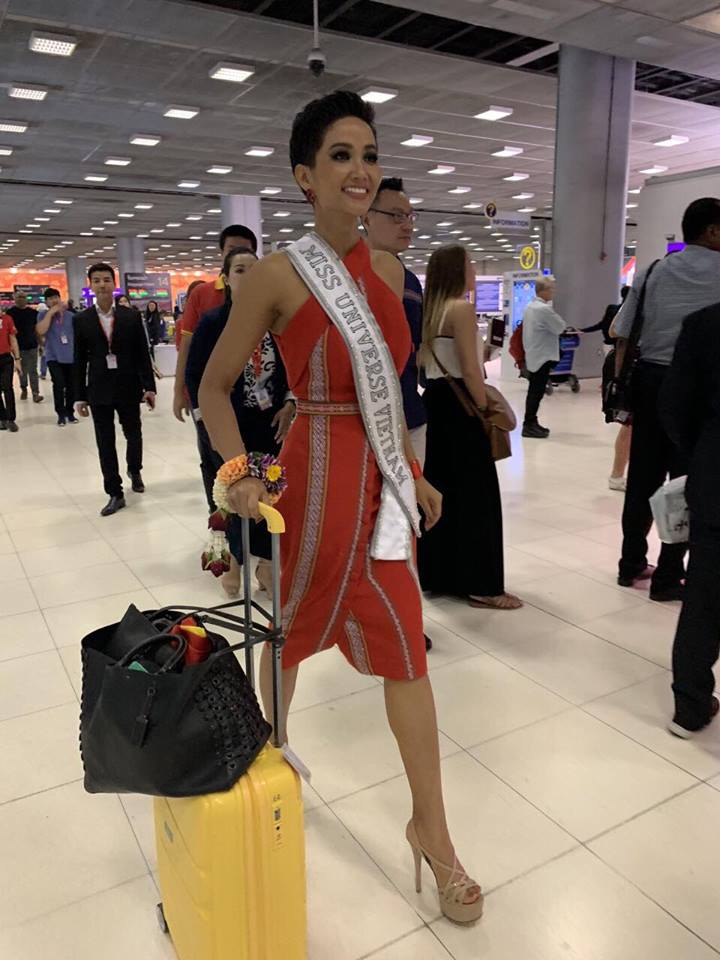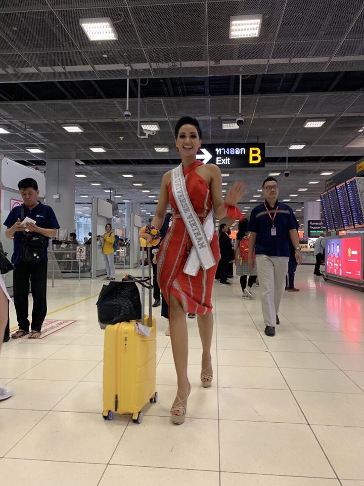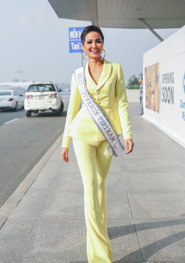 Trước đó ở sân bay Tân Sơn Nhất, H'Hen Niê tượng với trang phục cá tính vest sơ-mi vàng chanh kết hợp cùng quần dài ôm dáng nổi bật. Với số hành lý lên tới 80 bộ trang phục thì việc sử dụng 2 bộ trong vòng chỉ 1 tiếng rưỡi thì cũng không hề phí phạm.