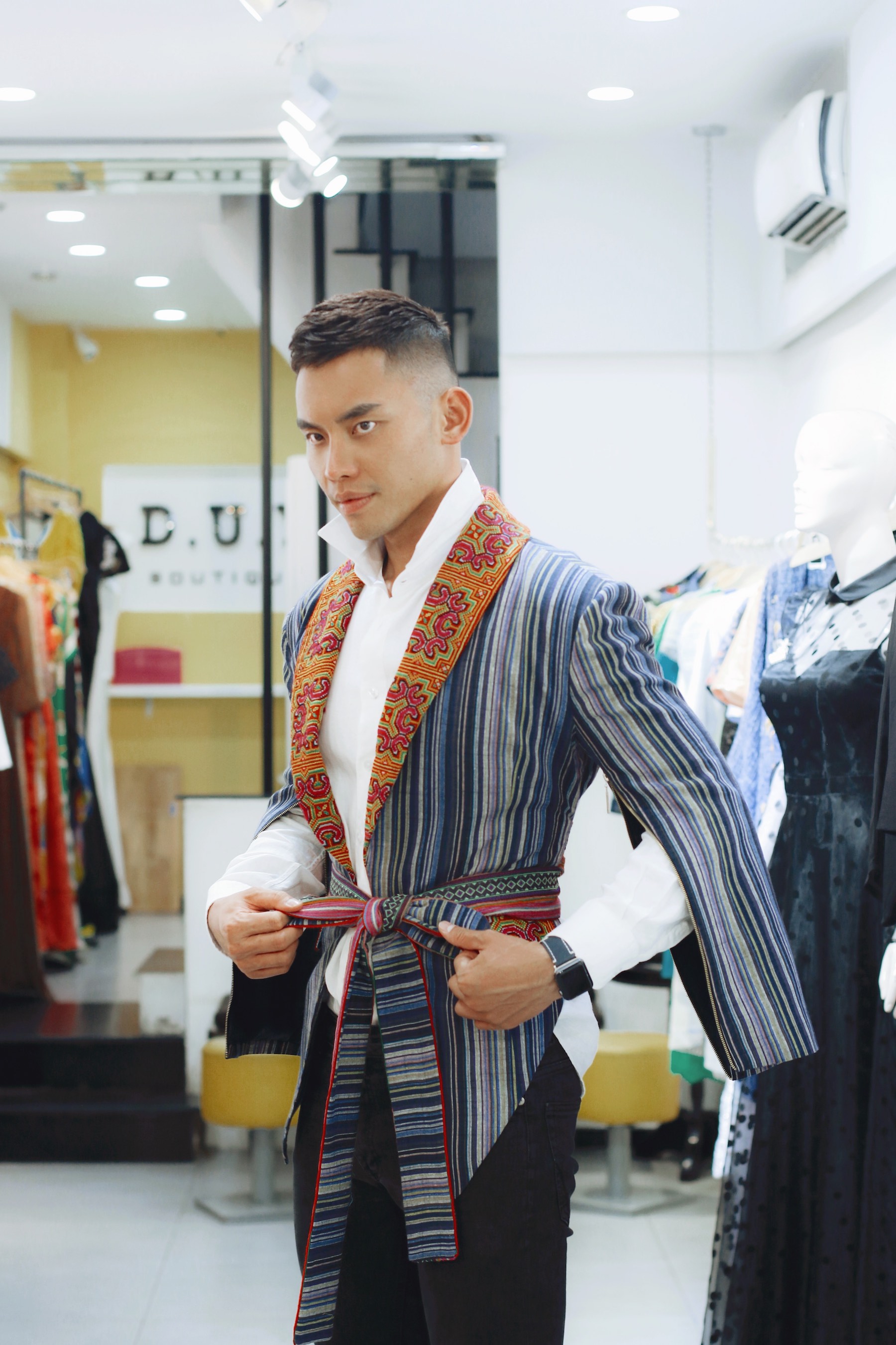 Ở hoạt động trên, Mạnh Khang một lần nữa ghi điểm với trang phục đặc biệt của mình. Anh diện áo vest thổ cẩm được NTK Nguyễn Trường Duy thực hiện dựa theo chiếc váy của người H’Mông. BTV điển trai thuộc Đài truyền hình Việt Nam bật mí chiếc áo đã được nhuộm lại màu để trông đỡ rực rỡ và hợp thời trang hơn.