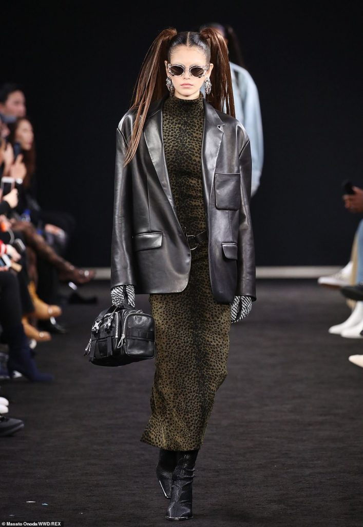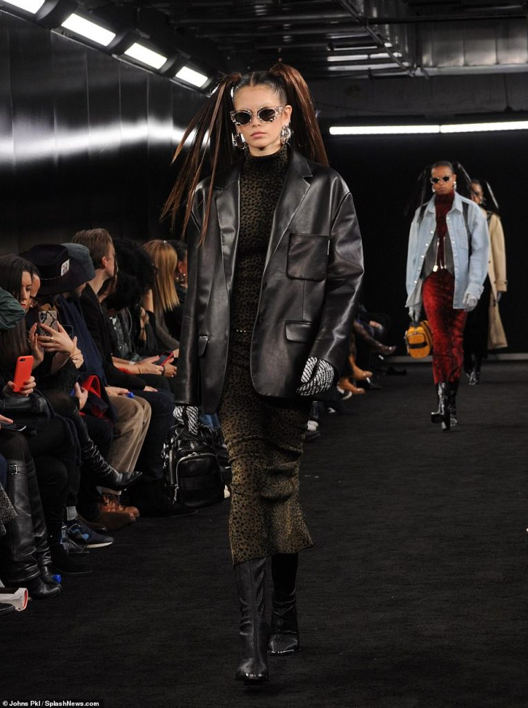 Trong buổi trình diễn Alexander Wang Collection 2 vừa qua, Kaia Gerber tiếp tục tỏa sáng trên sàn runway với kiểu tóc hai chùm cùng trang phục họa tiết da động vật khoác áo da ở ngoài cực kì “ngầu”.