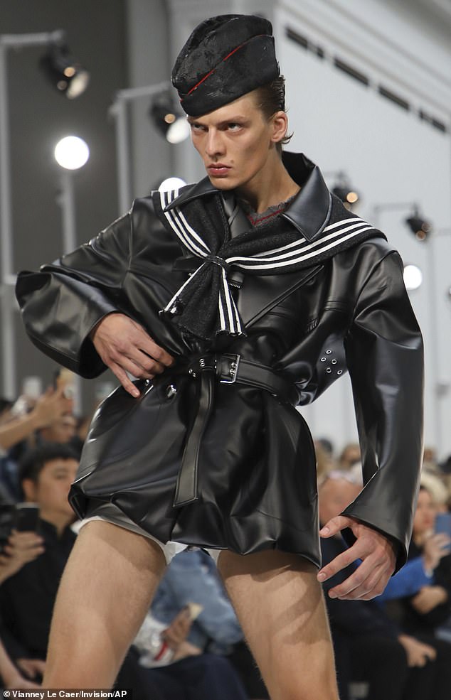 Leon khoác trên mình kiểu áo da cùng style nón hơi hướng thủy thủ, pose dáng kì lạ trên sàn catwalk