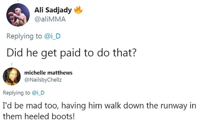 Loạt bình luận hài hước nói về phần trình diễn của anh trên sàn catwalk vừa qua. ” Anh ta được trả tiền để làm điều đó ư?” hay ” Tôi cũng sẽ rất giận dữ nếu như phải mang đôi boots cổ cao lêu nghêu ấy trên sàn catwalk”…
