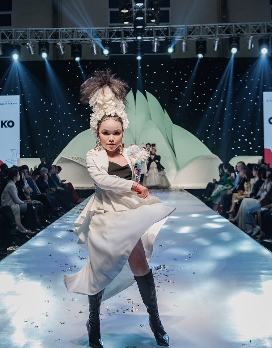 Cao Hữu Nhật, Trần Phạm Minh Anh, Đặng Minh Anh, Trần Phương Anh,… trang điểm ấn tượng đua nhau bung lụa trên sàn diễn. Những thiết kế vest, đầm dạ hội độc đáo đã ghi điểm mạnh mẽ đối với khán giả có mặt tại show diễn.