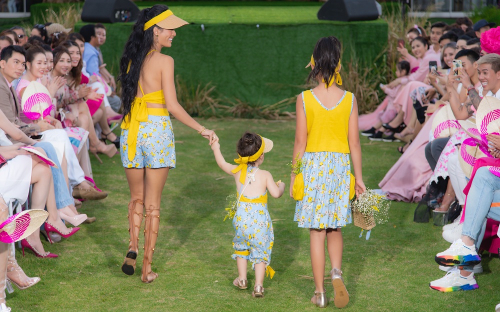 Đặc biệt, vị trí veddete được giao trọng trách cho 3 mẹ con nhà siêu mẫu Như Vân. Bé lớn nhà siêu mẫu 9X là Gia Bảo 10 tuổi, bé nhỏ là Gia Gia 2 tuổi - mang 2 dòng máu Việt - Mỹ đã mang đến sự tươi trẻ, tinh nghịch cho BST lần này.