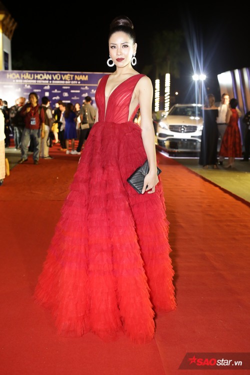 Xuất hiện trong đêm chung kết Hoa hậu Hoàn Vũ Việt Nam 2017, Á hậu Nguyễn Thị Loan diện đầm đỏ nổi bật. Chọn tông son matchy tuyệt đối với màu váy và kiểu tóc búi cao, Nguyễn Thị Loan cho thấy mình đã thôi không còn là cô gái chất phác năm nào, thay vào đó là vẻ đẹp sang chảnh, quyền lực.