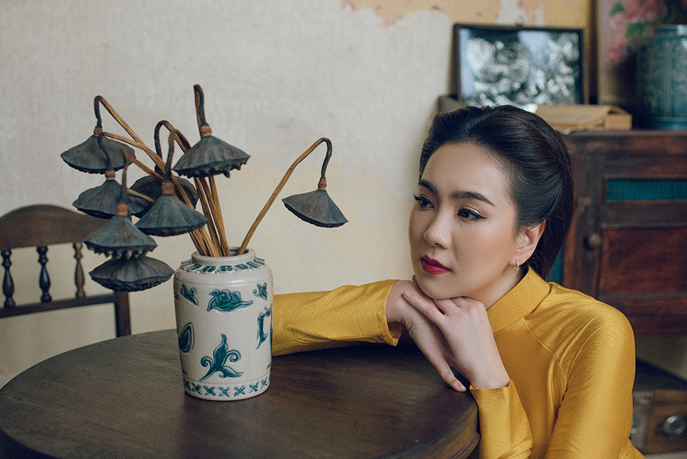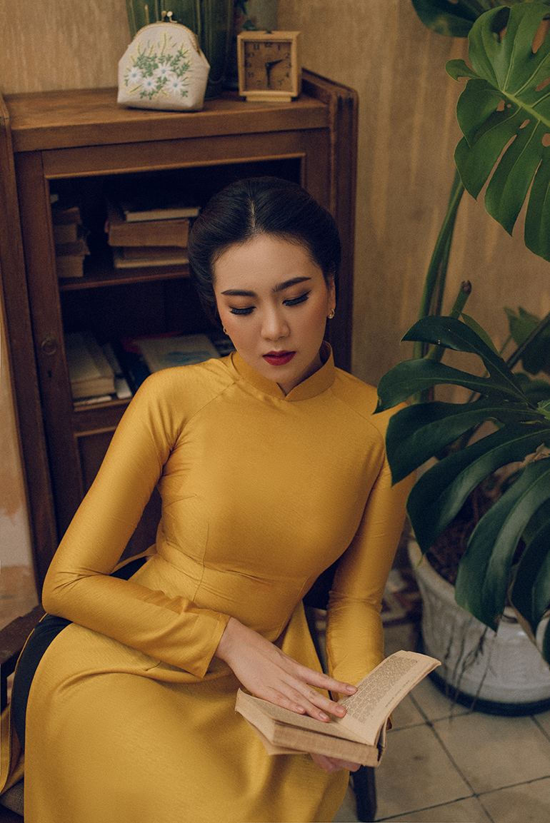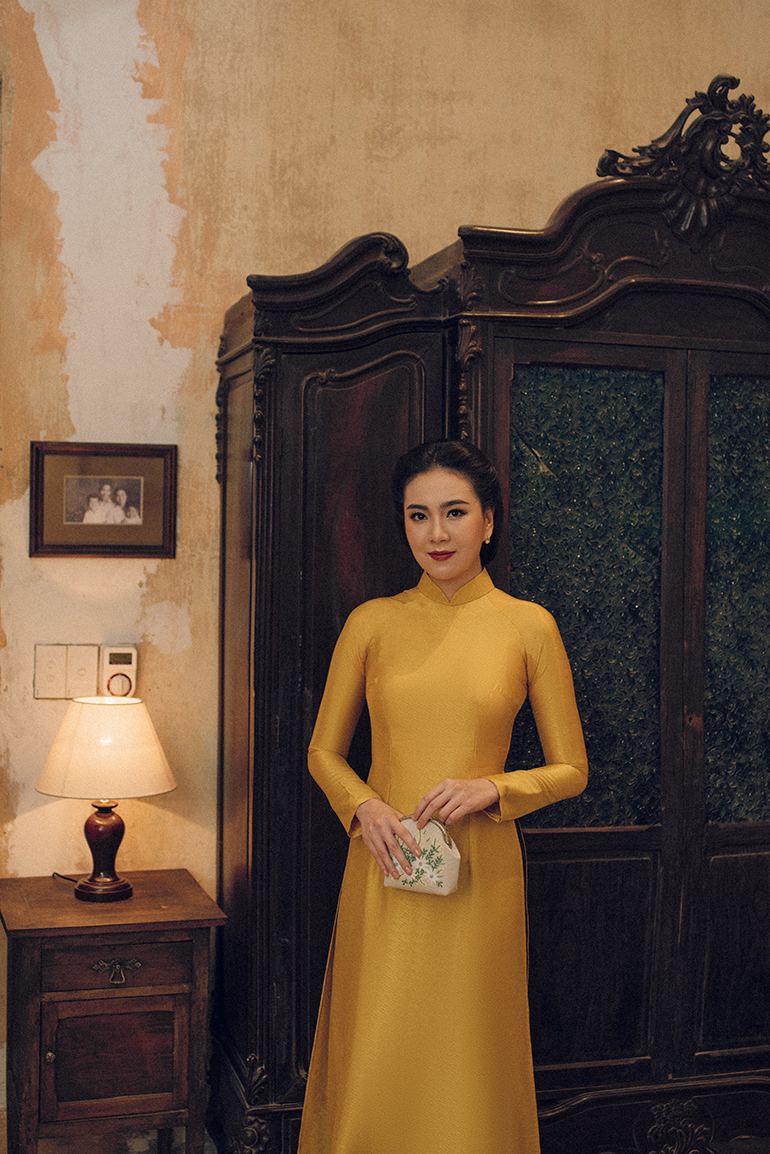Chiếc áo dài chất liệu gấm tơ tằm vân với màu vàng đơn sắc, thiết kế cổ 3 phân truyền thống giúp tôn lên vẻ đẹp của cô gái Hà thành - Mai Ngọc, đồng thời gợi lên cảm giác hoài niệm về những ngày xưa cũ.