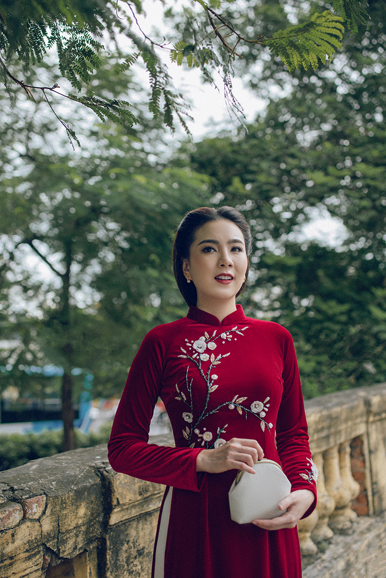 Áo dài nhung đỏ kiều diễm và quý phái