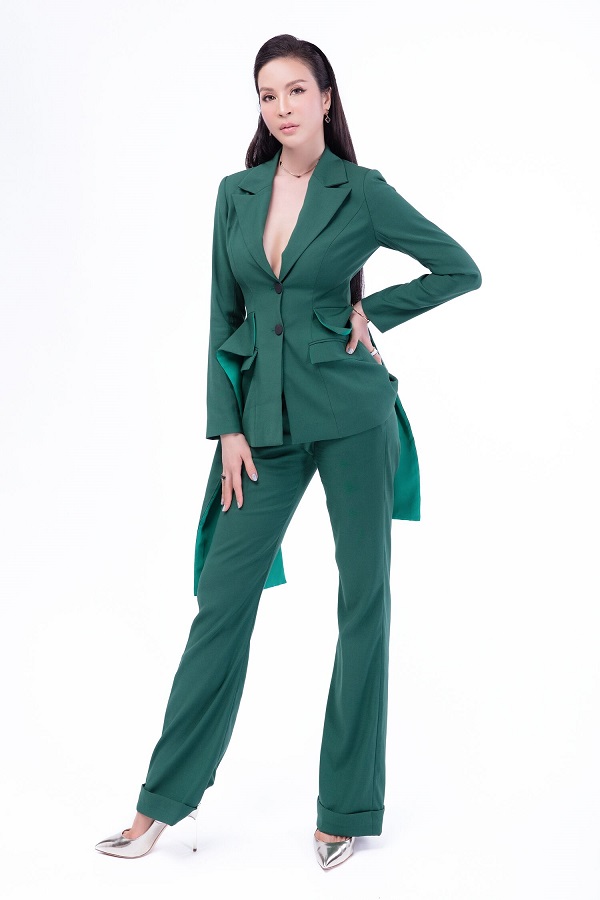Bộ vest được cắt may từ chất liệu vải cao cấp kết hợp với những đường cắt tinh tế tạo khoảng hở phóng khoáng cho trang phục, sự thanh lịch cho Thanh Mai.
