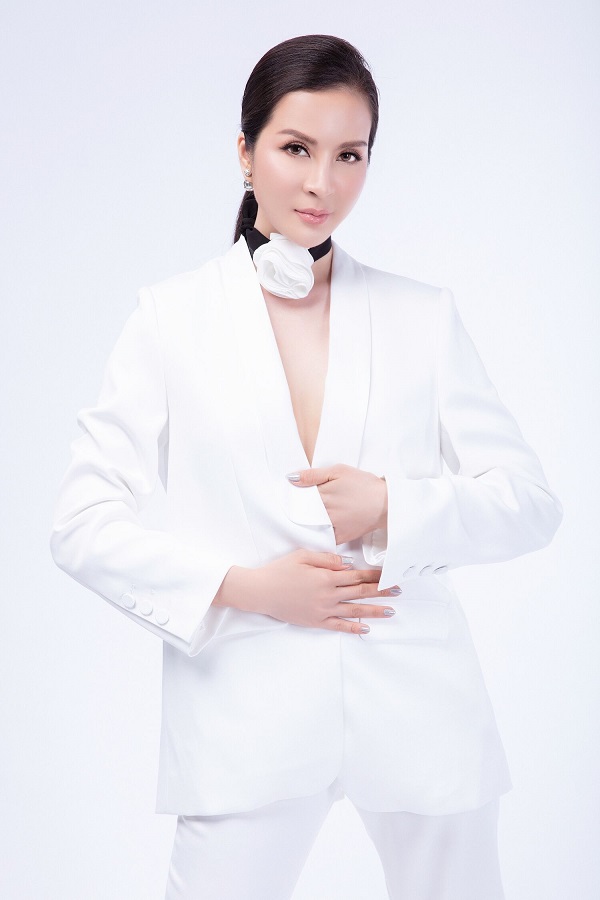 Với màu sắc sáng của bộ vest, Thanh Mai khéo léo tạo điểm nhấn bằng vòng choker hoa hồng ở cổ.